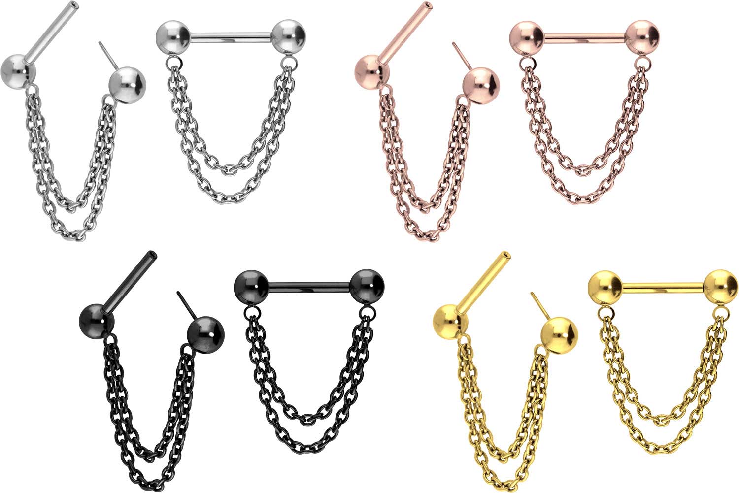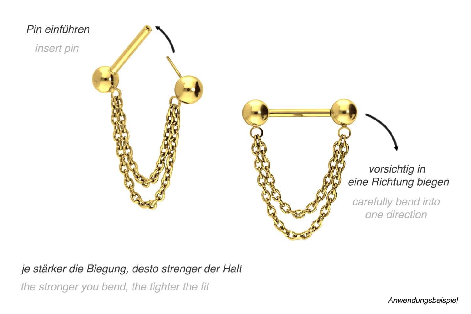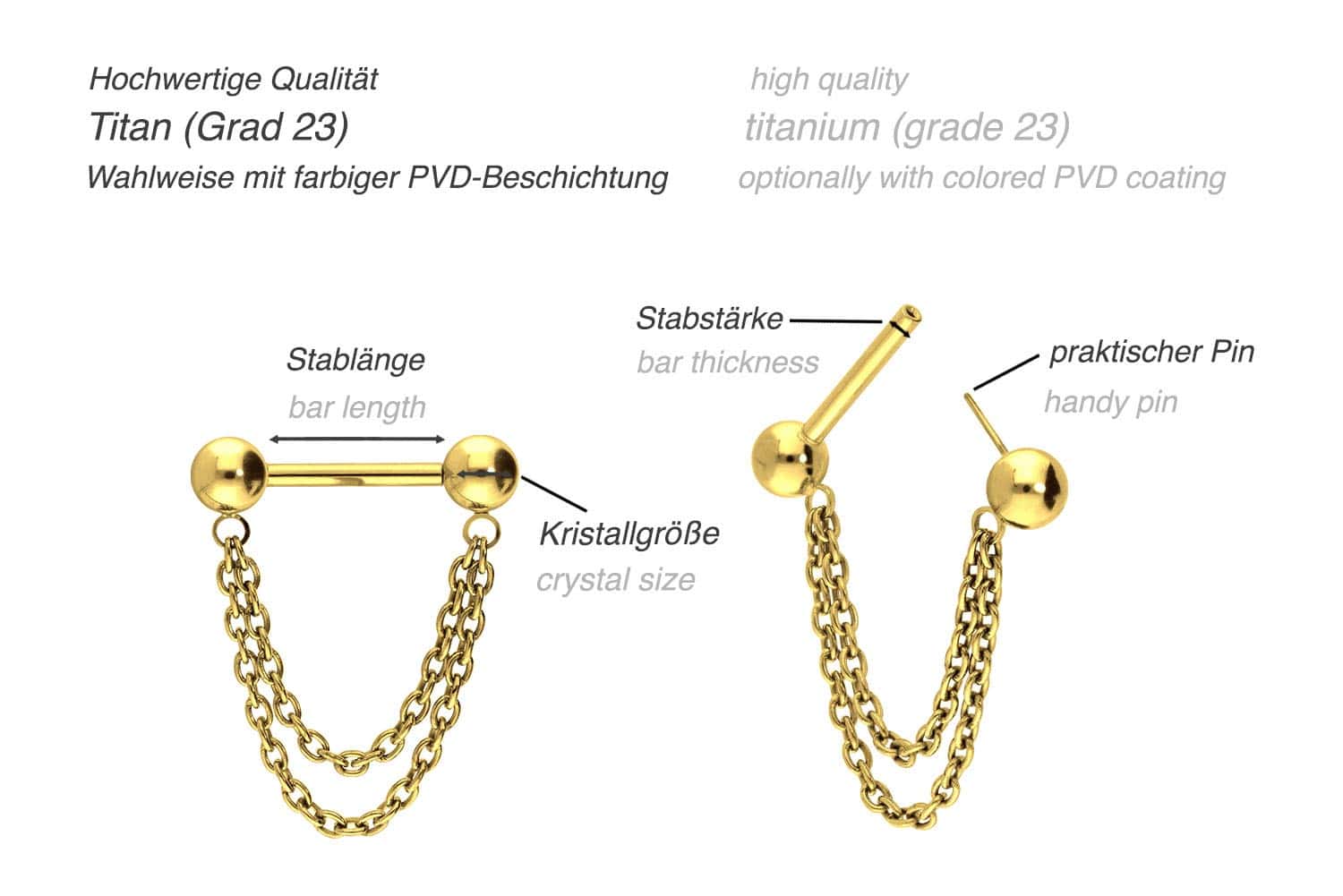 also guaranteed in the colored versions with PVD coating. On both sides, the barbell has a timelessly beautiful ball, one of which can be inserted into the bar using a push pin, while the other is attached to it. Both balls are connected to each other by two chains. The bar has a bar thickness of