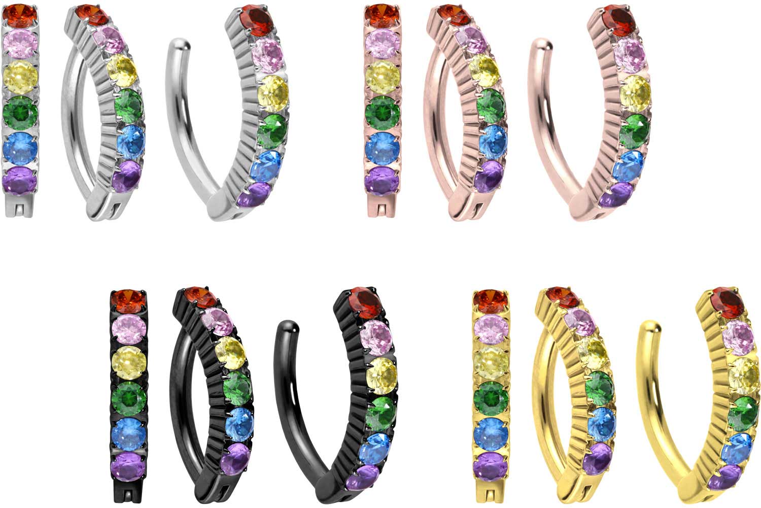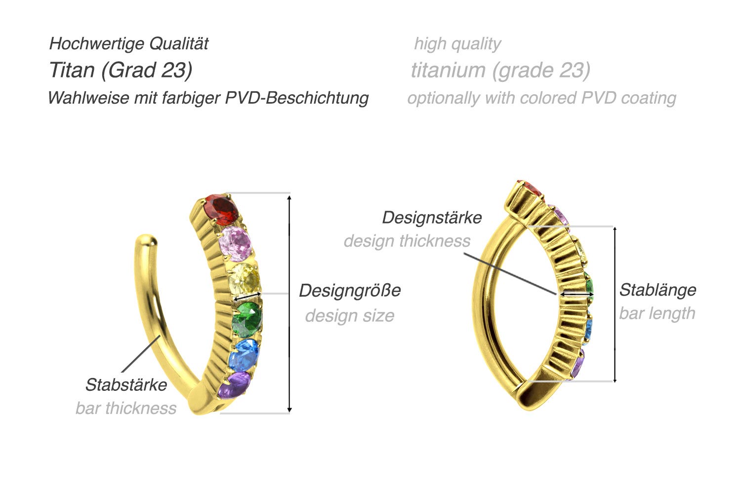 Easy handling and gorgeous design - that is what our clickers are all about! The main feature of the clickers is the practical hinge, which simplifies the insertion. The material used for manufacturing (titanium grade 23) is characterized by its good skin compatibility, high quality and durability. Depending on the desired color, the piercing is covered with a scratch-resistant PVD coating. As simple as elegant is the arch set with multicolored crystals that defines the design. This belly button clicker has a bar thickness of 1.6 mm, while its available bar length is 10 mm.Material: titanium (grade 23)