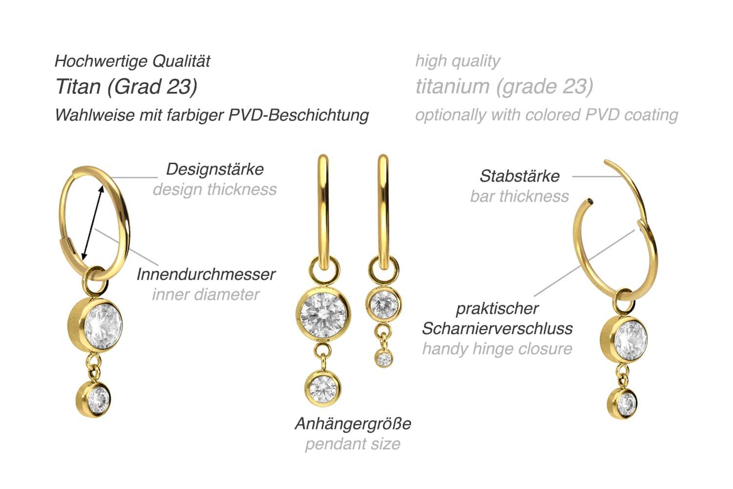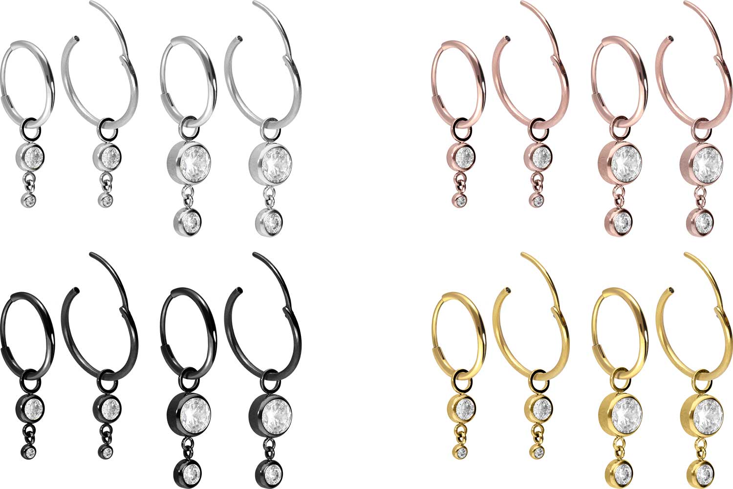 These timelessly beautiful ear clickers are made of high quality titanium, whose specific material properties include particularly good skin compatibility and high durability. Another characteristic of our clickers is the practical hinge, which makes the use of them much easier. If desired, a scratch-resistant PVD coating provides a powerful color of choice, further enhanced by the highly polished surface. As a visual highlight, a pendant showing two round crystals is hooked into each creole. Their insertable part has a bar thickness of 0.8 mm, whereas their visible design has a thickness of either 1.2 or 1.6 mm. The creoles are supplied in pairs as depicted.Material: titanium (grade 23)