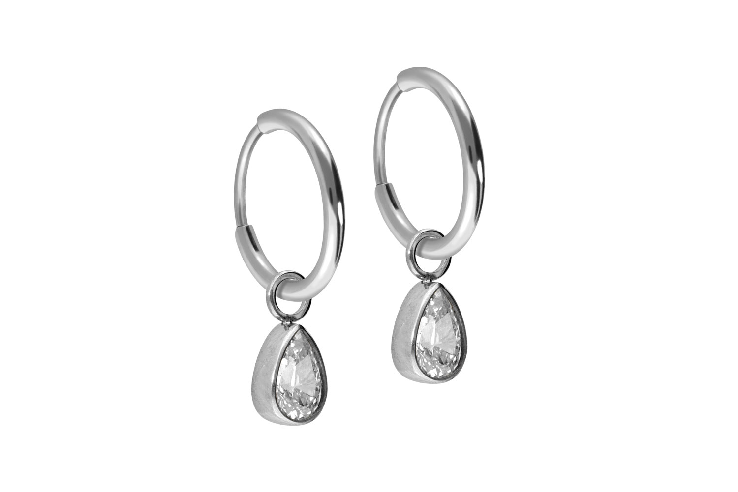 These timelessly beautiful ear clickers are made of high quality titanium, whose specific material properties include particularly good skin compatibility and high durability. Another characteristic of our clickers is the practical hinge, which makes the use of them much easier. If desired, a scratch-resistant PVD coating provides a powerful color of choice, further enhanced by the highly polished surface. As a visual highlight, a pendant showing a crystal drop is hooked into each creole. Their insertable part has a bar thickness of 0.8 mm, whereas their visible design has a thickness of either 1.2 or 1.6 mm. The creoles are supplied in pairs as depicted.Material: titanium (grade 23)