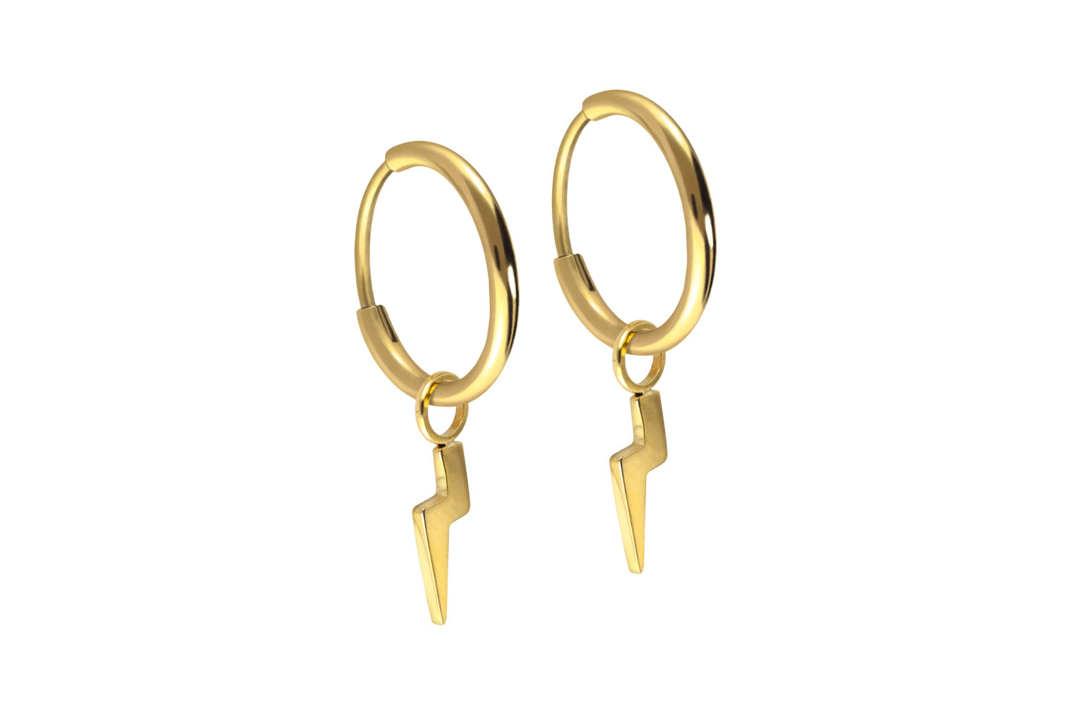 These timelessly beautiful ear clickers are made of high quality titanium, whose specific material properties include particularly good skin compatibility and high durability. Another characteristic of our clickers is the practical hinge, which makes the use of them much easier. If desired, a scratch-resistant PVD coating provides a powerful color of choice, further enhanced by the highly polished surface. As a visual highlight, a pendant showing a lightning is hooked into each creole. Their insertable part has a bar thickness of 0.8 mm, whereas their visible design has a thickness of either 1.2 or 1.6 mm. The creoles are supplied in pairs as depicted.Material: titanium (grade 23)