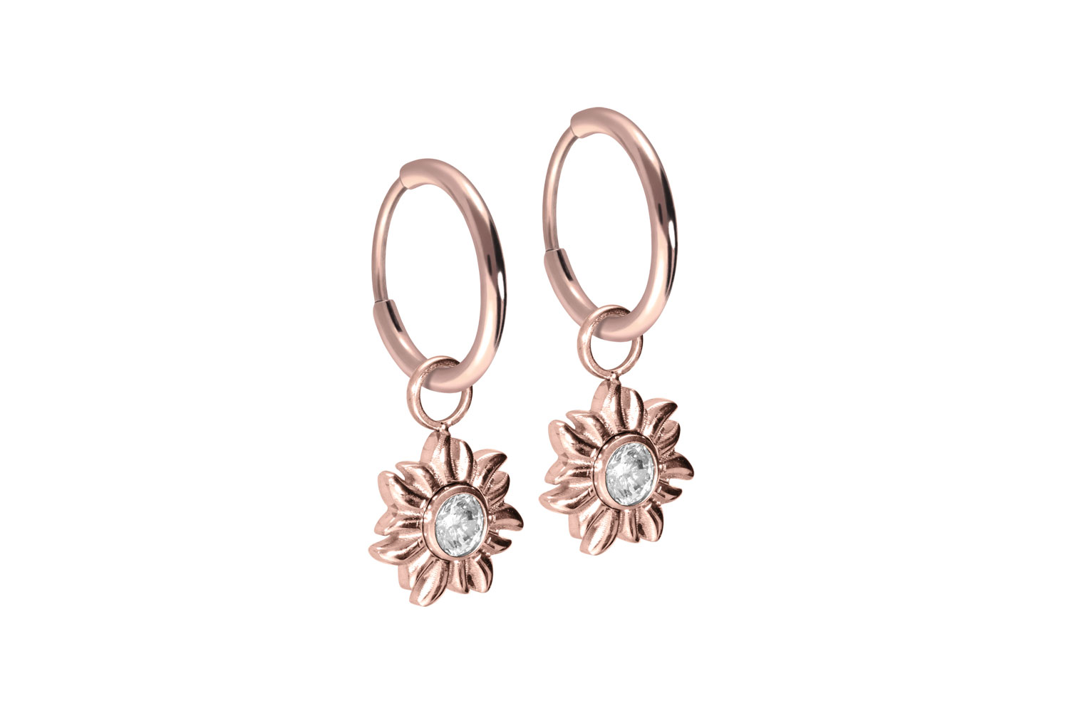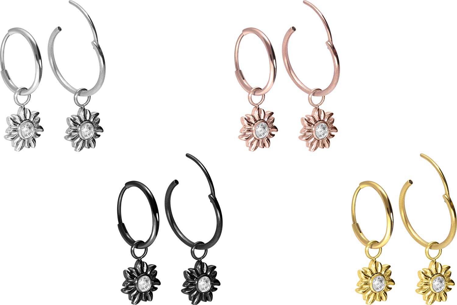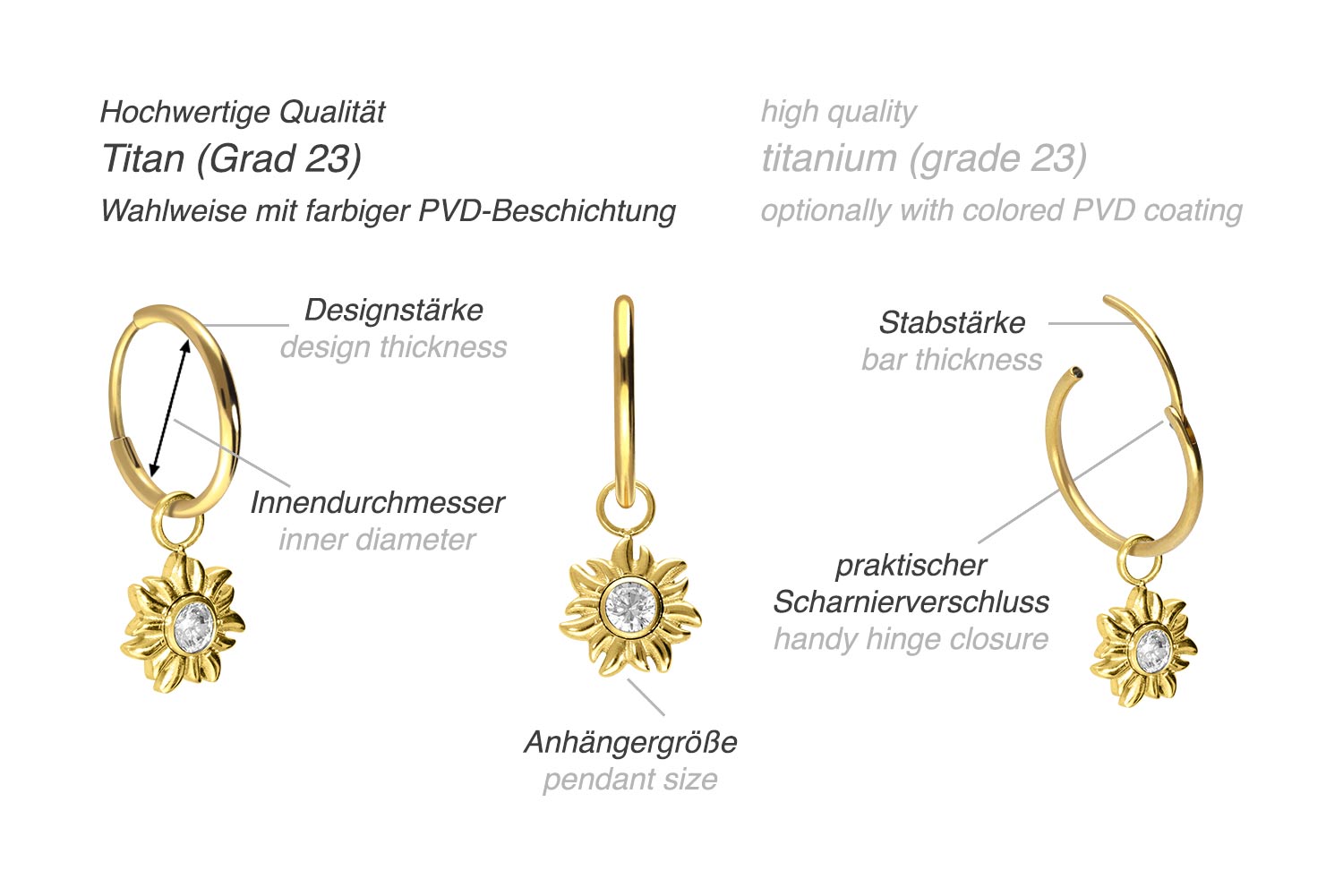 These timelessly beautiful ear clickers are made of high quality titanium, whose specific material properties include particularly good skin compatibility and high durability. Another characteristic of our clickers is the practical hinge, which makes the use of them much easier. If desired, a scratch-resistant PVD coating provides a powerful color of choice, further enhanced by the highly polished surface. As a visual highlight, a pendant showing a sun, which ist decorated with a sparkling crystal, is hooked into each creole. Their insertable part has a bar thickness of 0.8 mm, whereas their visible design has a thickness of either 1.2 or 1.6 mm. The creoles are supplied in pairs as depicted.Material: titanium (grade 23)