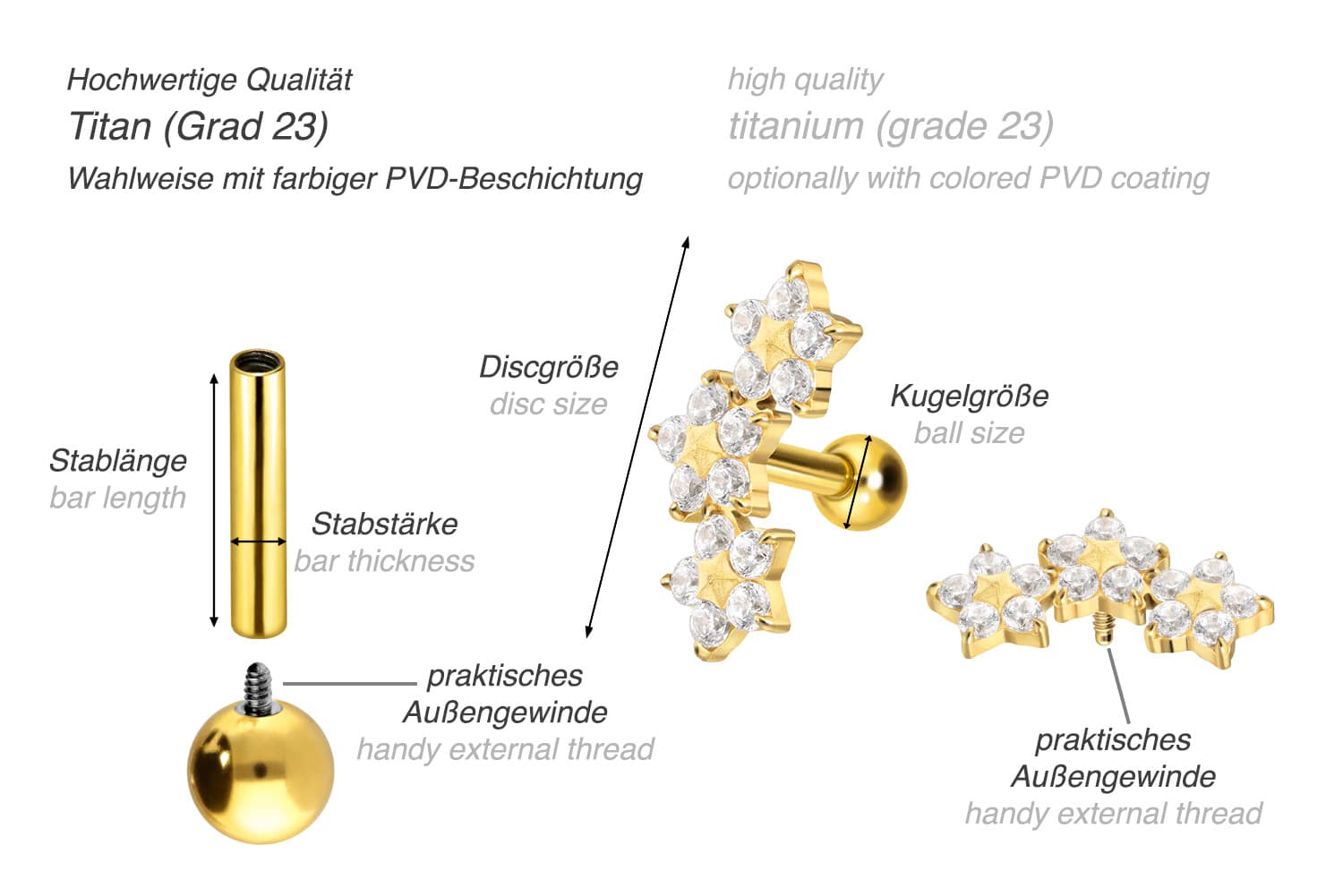 This stunningly beautiful ear piercing is made of high quality titanium, which is also known for material properties such as particularly good skin compatibility and high durability. Another of its advantages is color fastness, also guaranteed in the colored versions with PVD coating. Thanks to the appealing design, consisting of a timelessly beautiful screw-in attachment with external thread in form of three crystal flowers, the piece of jewelry acquires a unique charm. The ear piercing has a bar thickness of 1.2 mm and a bar length of either 6 or 8 mm. Furthermore, both the attachment as well as the rear 3 mm ball through their 0.9 mm internal thread can be exchanged at will with all of our other screw-in attachments with this kind of external thread.