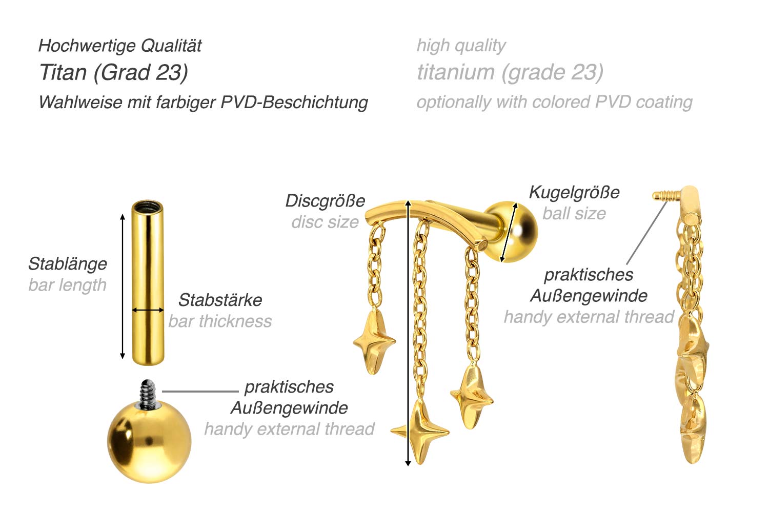 This stunningly beautiful ear piercing is made of high quality titanium, which is also known for material properties such as particularly good skin compatibility and high durability. Another of its advantages is color fastness, also guaranteed in the colored versions with PVD coating. Thanks to the appealing design, consisting of a timelessly beautiful screw-in attachment with external thread in form of an arch, to which three stars are attached, the piece of jewelry acquires a unique charm. The ear piercing has a bar thickness of 1.2 mm and a bar length of either 6 or 8 mm. Furthermore, both the attachment as well as the rear 3 mm ball through their 0.9 mm internal thread can be exchanged at will with all of our other screw-in attachments with this kind of external thread.