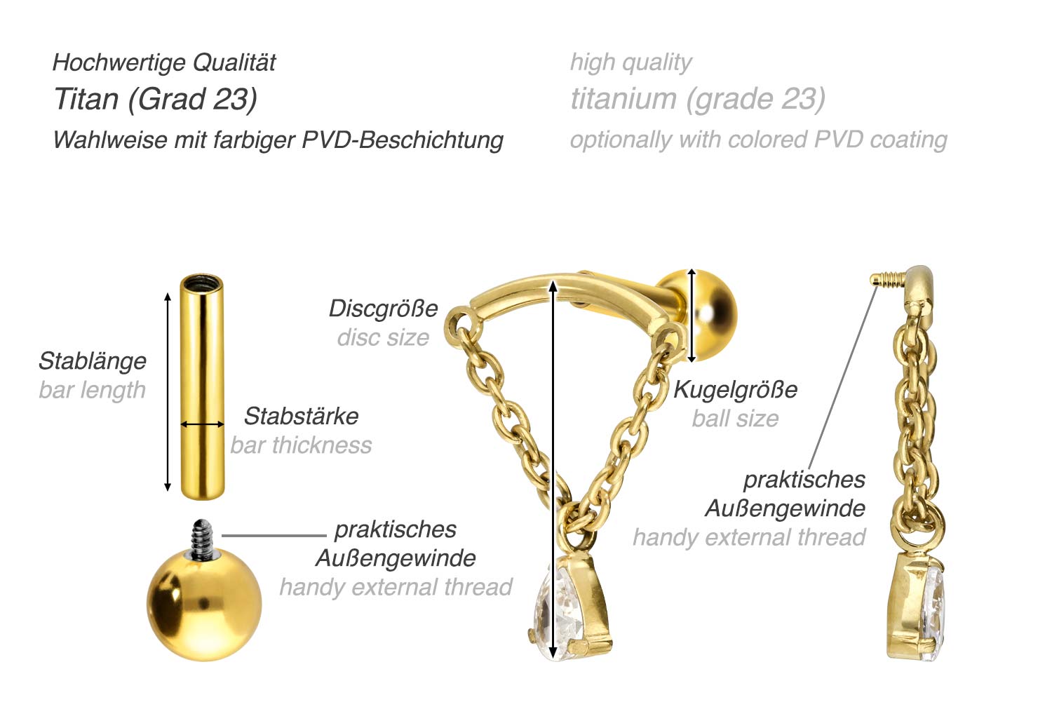 This stunningly beautiful ear piercing is made of high quality titanium, which is also known for material properties such as particularly good skin compatibility and high durability. Another of its advantages is color fastness, also guaranteed in the colored versions with PVD coating. Thanks to the appealing design, consisting of a timelessly beautiful screw-in attachment with external thread in form of an arch, to which a chain with a movable crystal drop is attached, the piece of jewelry acquires a unique charm. The ear piercing has a bar thickness of 1.2 mm and a bar length of either 6 or 8 mm. Furthermore, both the attachment as well as the rear 3 mm ball through their 0.9 mm internal thread can be exchanged at will with all of our other screw-in attachments with this kind of external thread.