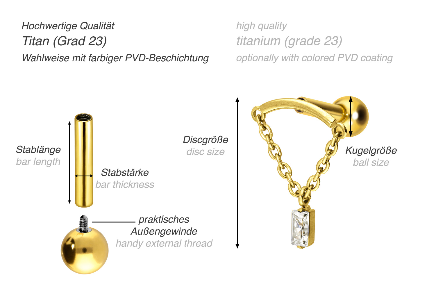 This stunningly beautiful ear piercing is made of high quality titanium, which is also known for material properties such as particularly good skin compatibility and high durability. Another of its advantages is color fastness, also guaranteed in the colored versions with PVD coating. Thanks to the appealing design, consisting of a timelessly beautiful screw-in attachment with external thread in form of an arch, to which a chain with a movable crystal rectangle is attached, the piece of jewelry acquires a unique charm. The ear piercing has a bar thickness of 1.2 mm and a bar length of either 6 or 8 mm. Furthermore, both the attachment as well as the rear 3 mm ball through their 0.9 mm internal thread can be exchanged at will with all of our other screw-in attachments with this kind of external thread.