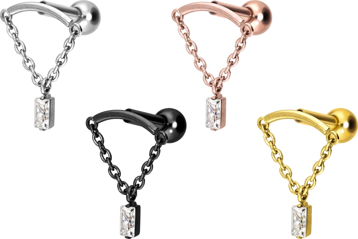 Titanium - Ear Piercing with internal Thread Arch + Chain + Crystal Rectangle