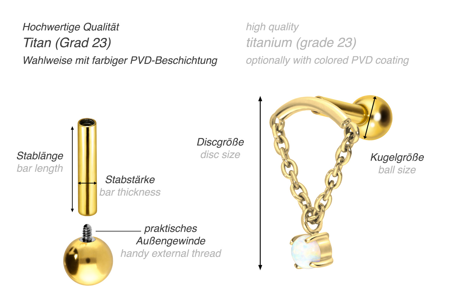 This stunningly beautiful ear piercing is made of high quality titanium, which is also known for material properties such as particularly good skin compatibility and high durability. Another of its advantages is color fastness, also guaranteed in the colored versions with PVD coating. Thanks to the appealing design, consisting of a timelessly beautiful screw-in attachment with external thread in form of an arch, to which a chain with a movable synthetic opal is attached, the piece of jewelry acquires a unique charm. The ear piercing has a bar thickness of 1.2 mm and a bar length of either 6 or 8 mm. Furthermore, both the attachment as well as the rear 3 mm ball through their 0.9 mm internal thread can be exchanged at will with all of our other screw-in attachments with this kind of external thread.