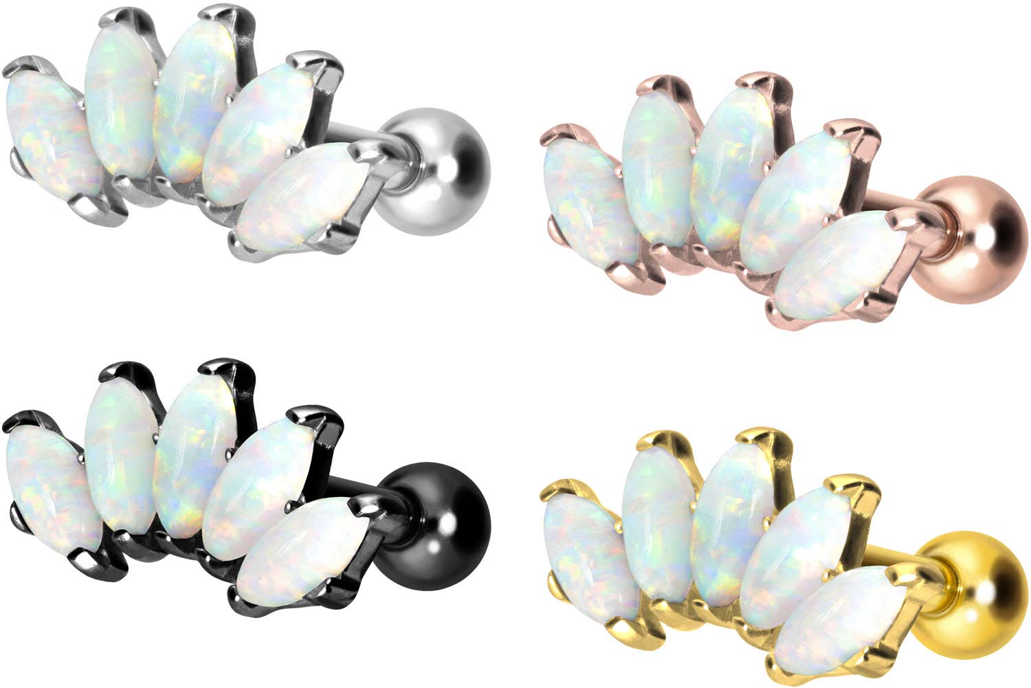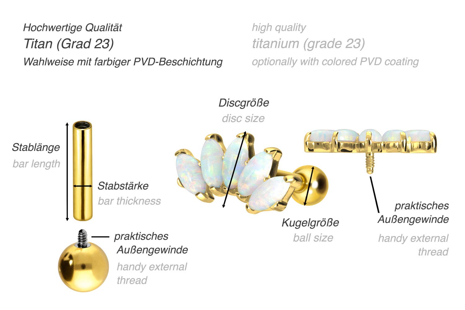 This stunningly beautiful ear piercing is made of high quality titanium, which is also known for material properties such as particularly good skin compatibility and high durability. Another of its advantages is color fastness, also guaranteed in the colored versions with PVD coating. Thanks to the appealing design, consisting of a timelessly beautiful screw-in attachment with external thread in form of an arch, which is decorated with synthetic opals, the piece of jewelry acquires a unique charm. The ear piercing has a bar thickness of 1.2 mm and a bar length of either 6 or 8 mm. Furthermore, both the attachment as well as the rear 3 mm ball through their 0.9 mm internal thread can be exchanged at will with all of our other screw-in attachments with this kind of external thread.