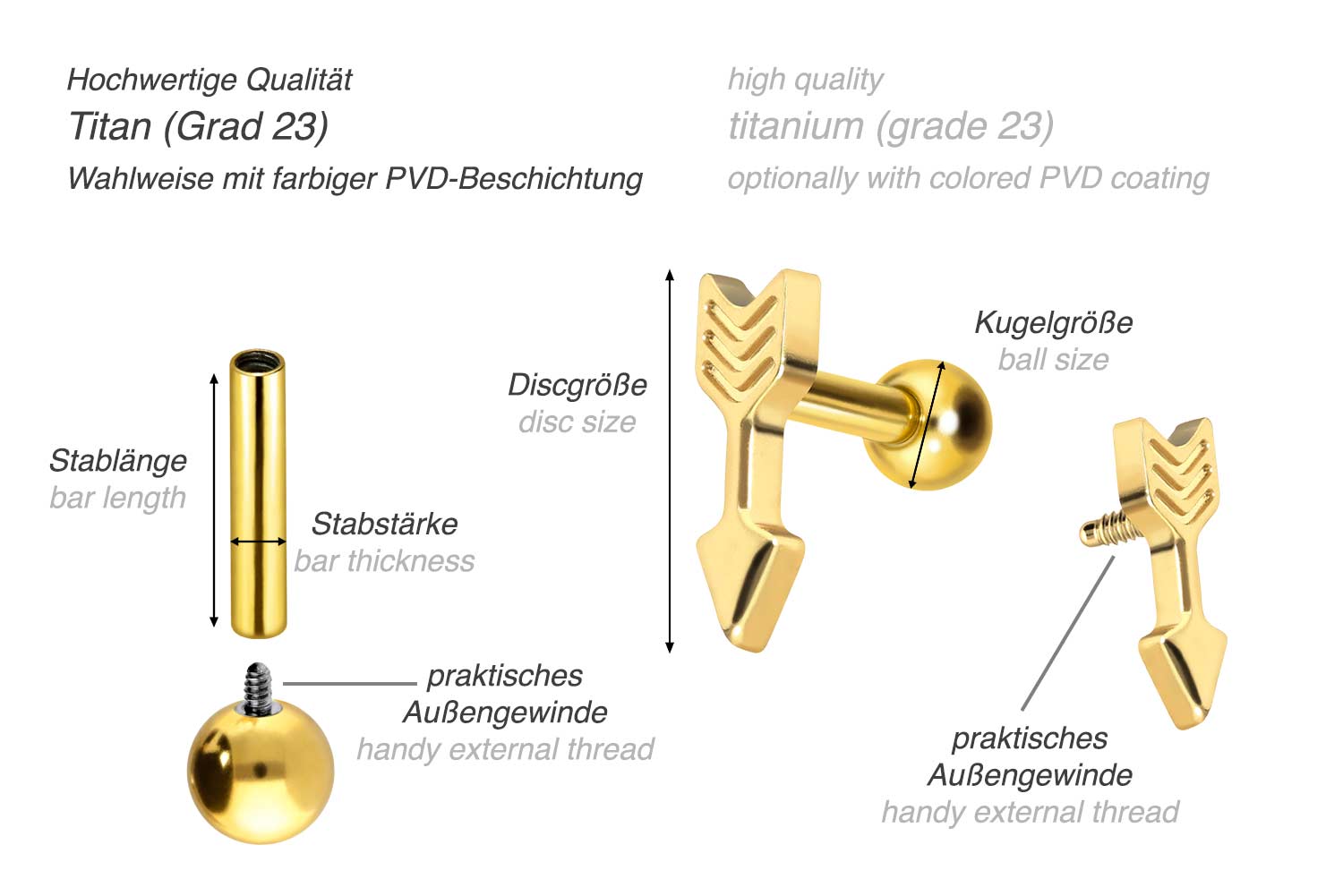 This stunningly beautiful ear piercing is made of high quality titanium, which is also known for material properties such as particularly good skin compatibility and high durability. Another of its advantages is color fastness, also guaranteed in the colored versions with PVD coating. Thanks to the appealing design, consisting of a timelessly beautiful screw-in attachment with external thread in form of an arrow, the piece of jewelry acquires a unique charm. The ear piercing has a bar thickness of 1.2 mm and a bar length of either 6 or 8 mm. Furthermore, both the attachment as well as the rear 3 mm ball through their 0.9 mm internal thread can be exchanged at will with all of our other screw-in attachments with this kind of external thread.