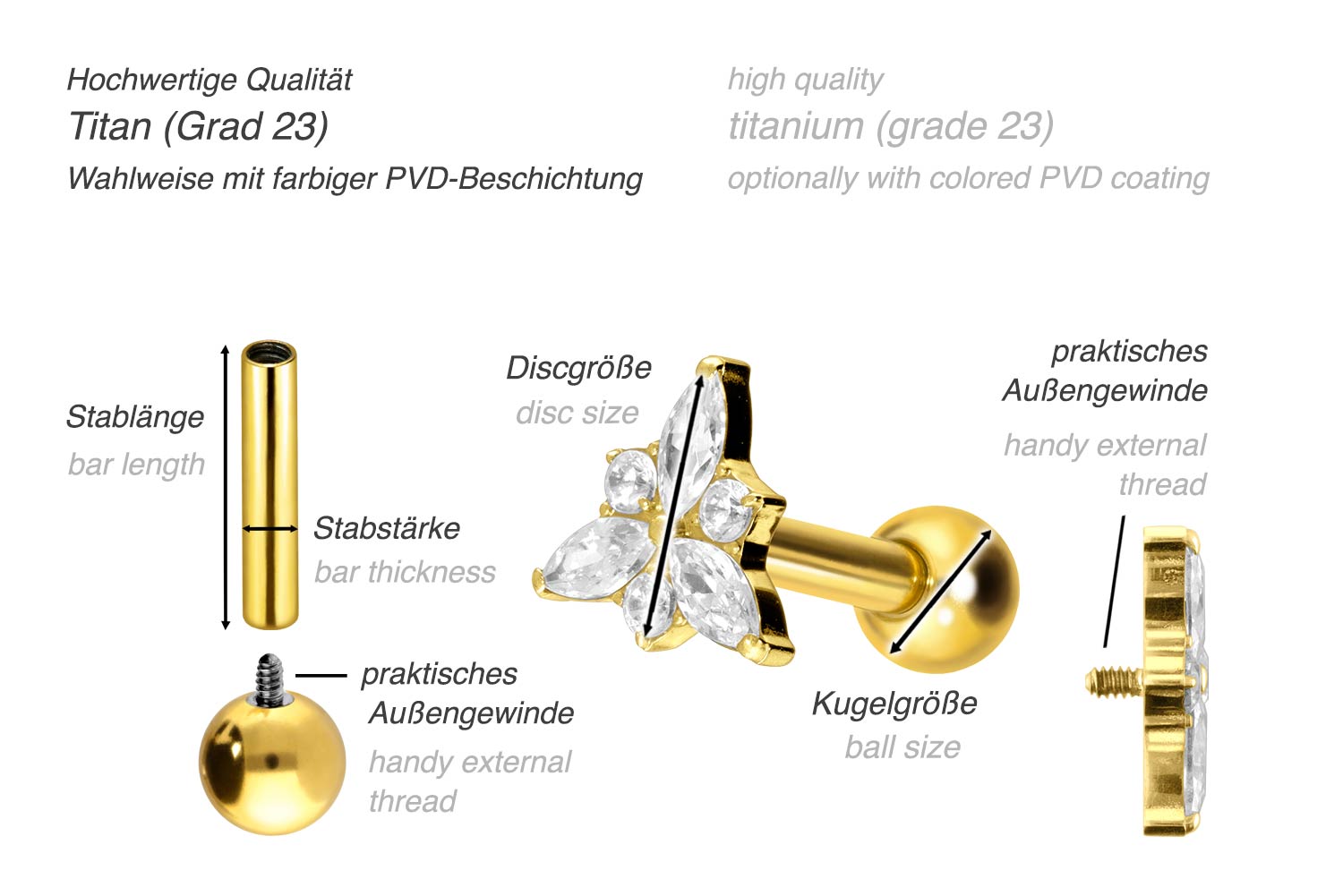 This stunningly beautiful ear piercing is made of high quality titanium, which is also known for material properties such as particularly good skin compatibility and high durability. Another of its advantages is color fastness, also guaranteed in the colored versions with PVD coating. Thanks to the appealing design, consisting of a timelessly beautiful screw-in attachment with external thread in form of a blossom, the piece of jewelry acquires a unique charm. The ear piercing has a bar thickness of 1.2 mm and a bar length of either 6 or 8 mm. Furthermore, both the attachment as well as the rear 3 mm ball through their 0.9 mm internal thread can be exchanged at will with all of our other screw-in attachments with this kind of external thread.