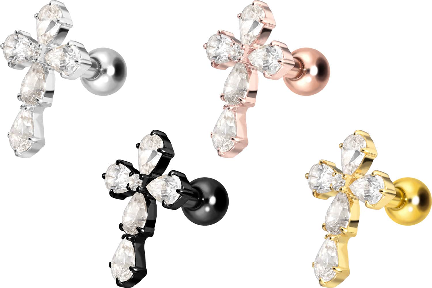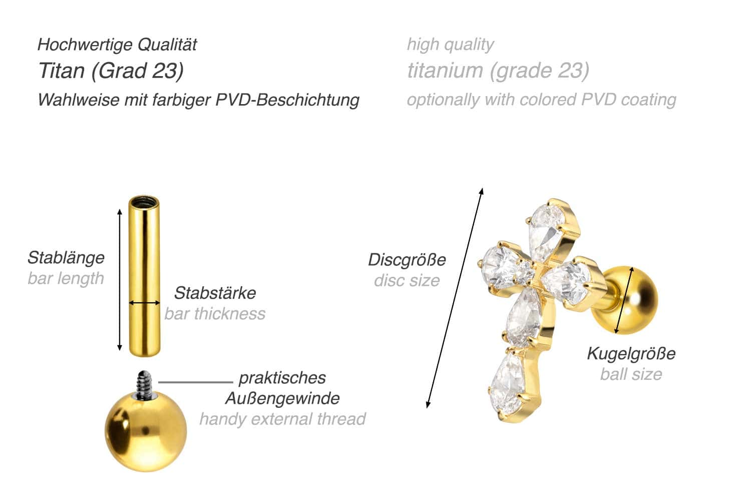 This stunningly beautiful ear piercing is made of high quality titanium, which is also known for material properties such as particularly good skin compatibility and high durability. Another of its advantages is color fastness, also guaranteed in the colored versions with PVD coating. Thanks to the appealing design, consisting of a timelessly beautiful screw-in attachment with external thread in form of a crystal cross, the piece of jewelry acquires a unique charm. The ear piercing has a bar thickness of 1.2 mm and a bar length of either 6 or 8 mm. Furthermore, both the attachment as well as the rear 3 mm ball through their 0.9 mm internal thread can be exchanged at will with all of our other screw-in attachments with this kind of external thread.