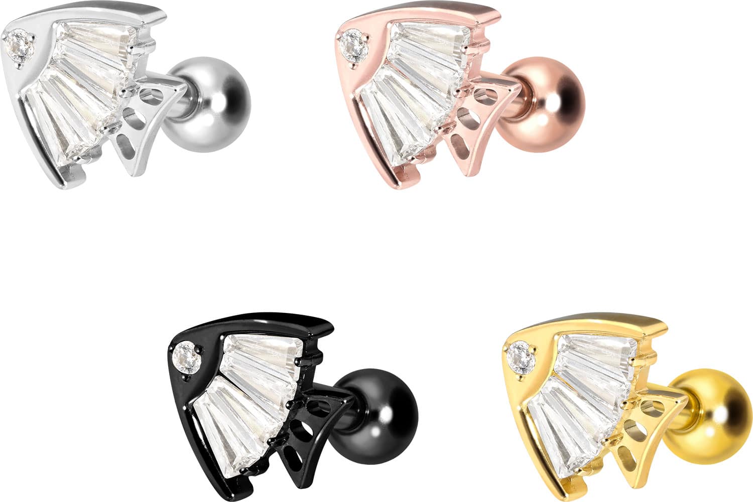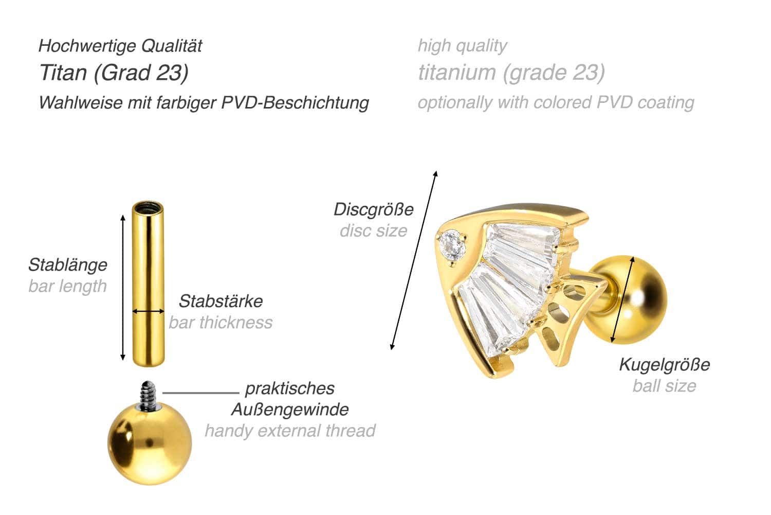 This stunningly beautiful ear piercing is made of high quality titanium, which is also known for material properties such as particularly good skin compatibility and high durability. Another of its advantages is color fastness, also guaranteed in the colored versions with PVD coating. Thanks to the appealing design, consisting of a timelessly beautiful screw-in attachment with external thread in form of a crystal fish, the piece of jewelry acquires a unique charm. The ear piercing has a bar thickness of 1.2 mm and a bar length of either 6 or 8 mm. Furthermore, both the attachment as well as the rear 3 mm ball through their 0.9 mm internal thread can be exchanged at will with all of our other screw-in attachments with this kind of external thread.