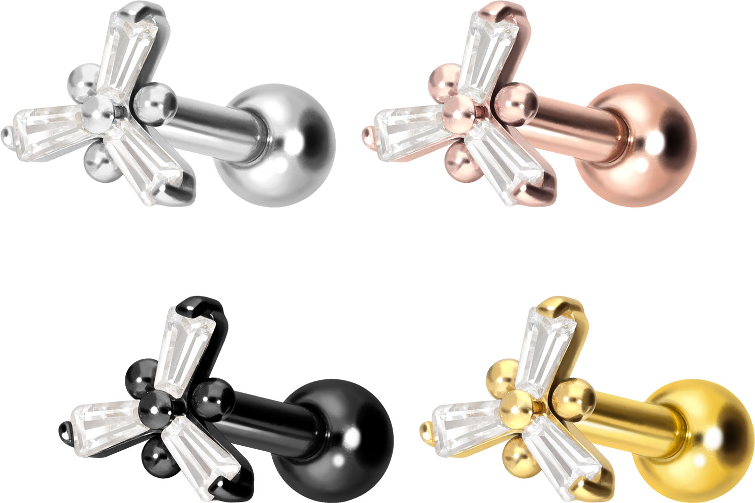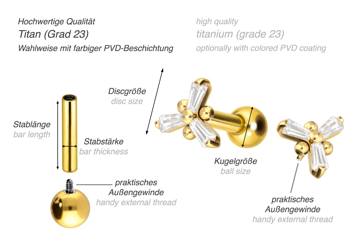 This stunningly beautiful ear piercing is made of high quality titanium, which is also known for material properties such as particularly good skin compatibility and high durability. Another of its advantages is color fastness, also guaranteed in the colored versions with PVD coating. Thanks to the appealing design, consisting of a timelessly beautiful screw-in attachment with external thread in form of a crystal flower, the piece of jewelry acquires a unique charm. The ear piercing has a bar thickness of 1.2 mm and a bar length of either 6 or 8 mm. Furthermore, both the attachment as well as the rear 3 mm ball through their 0.9 mm internal thread can be exchanged at will with all of our other screw-in attachments with this kind of external thread.