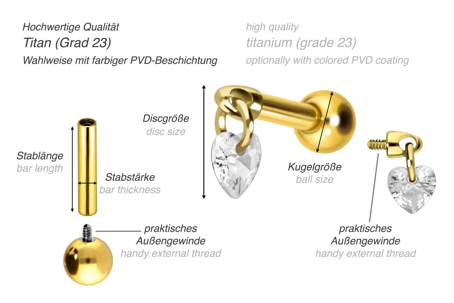 This stunningly beautiful ear piercing is made of high quality titanium, which is also known for material properties such as particularly good skin compatibility and high durability. Another of its advantages is color fastness, also guaranteed in the colored versions with PVD coating. Thanks to the appealing design, consisting of a timelessly beautiful screw-in attachment with external thread in form of a sparkling heart, the piece of jewelry acquires a unique charm. The ear piercing has a bar thickness of 1.2 mm and a bar length of either 6 or 8 mm. Furthermore, both the attachment as well as the rear 3 mm ball through their 0.9 mm internal thread can be exchanged at will with all of our other screw-in attachments with this kind of external thread.