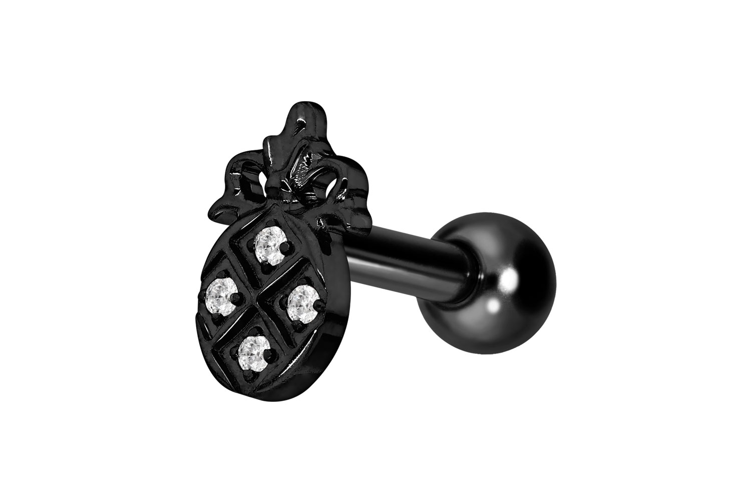 also guaranteed in the colored versions with PVD coating. Thanks to the appealing design, consisting of a timelessly beautiful screw-in attachment with external thread in form of a sparkling pineapple, the piece of jewelry acquires a unique charm. The ear piercing has a bar thickness of 1.2 mm and a bar length of either 6 or 8 mm.