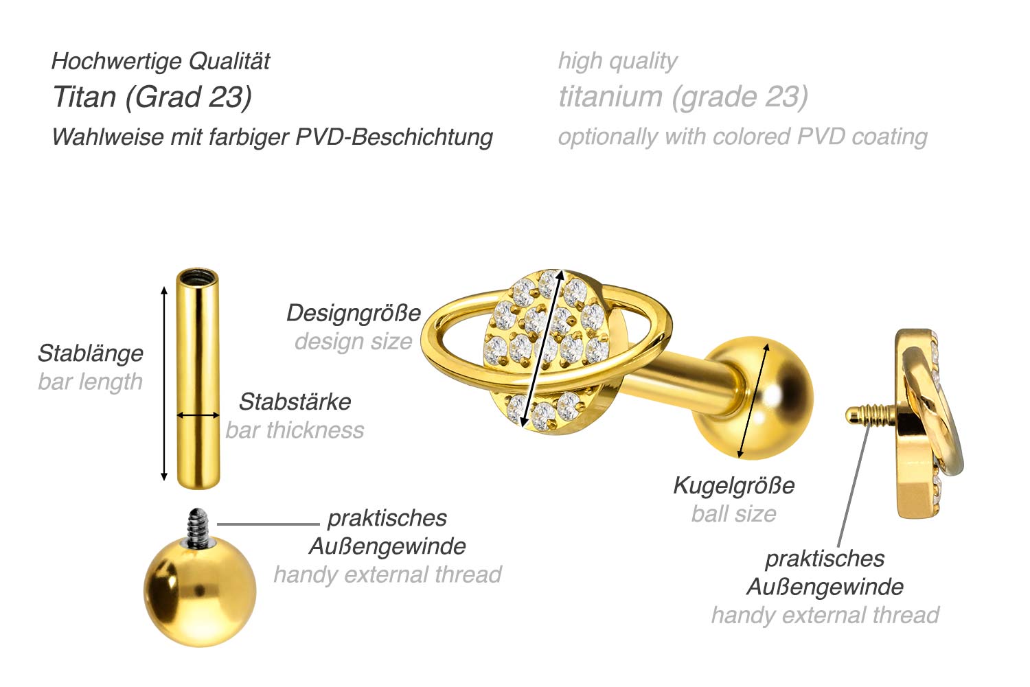 also guaranteed in the colored versions with PVD coating. Thanks to the appealing design, consisting of a timelessly beautiful screw-in attachment with external thread in form of a planet, the piece of jewelry acquires a unique charm. The ear piercing has a bar thickness of 1.2 mm and a bar length of either 6 or 8 mm.