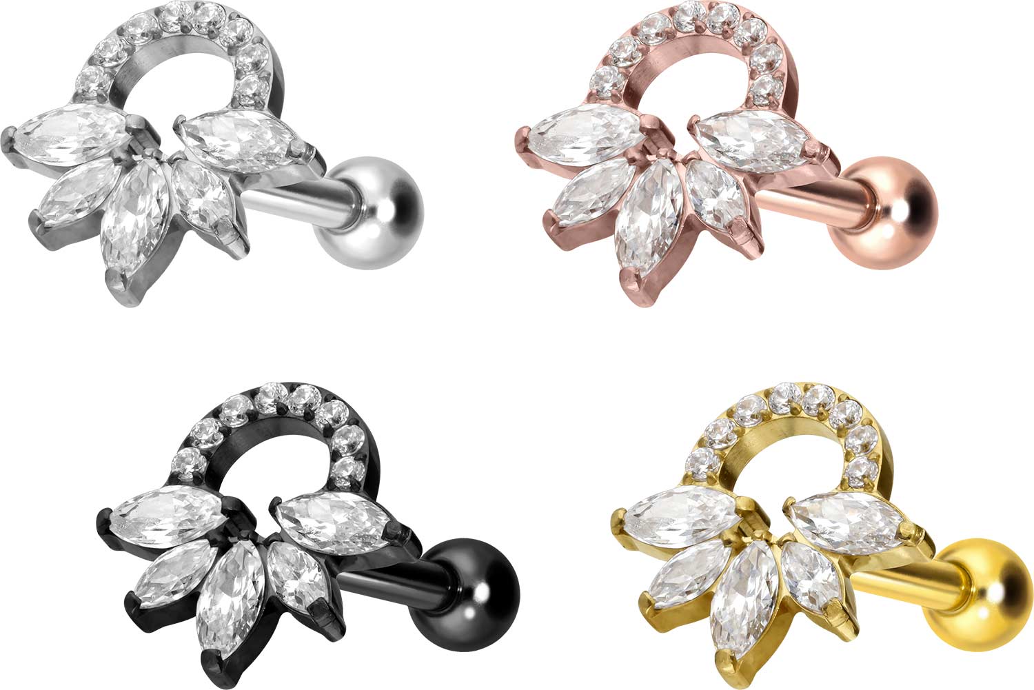 This stunningly beautiful ear piercing is made of high quality titanium, which is also known for material properties such as particularly good skin compatibility and high durability. Another of its advantages is color fastness, also guaranteed in the colored versions with PVD coating. Thanks to the appealing design, consisting of a timelessly beautiful screw-in attachment with external thread in form of a crystal rattle, the piece of jewelry acquires a unique charm. The ear piercing has a bar thickness of 1.2 mm and a bar length of either 6 or 8 mm. Furthermore, both the attachment as well as the rear 3 mm ball through their 0.9 mm internal thread can be exchanged at will with all of our other screw-in attachments with this kind of external thread.