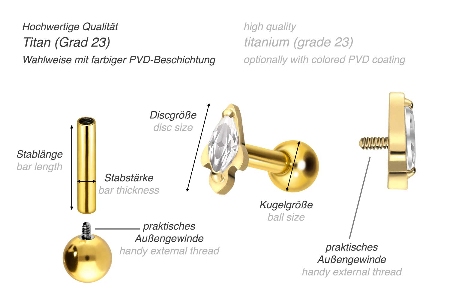 This stunningly beautiful ear piercing is made of high quality titanium, which is also known for material properties such as particularly good skin compatibility and high durability. Another of its advantages is color fastness, also guaranteed in the colored versions with PVD coating. Thanks to the appealing design, consisting of a timelessly beautiful screw-in attachment with external thread in form of a rocket, the piece of jewelry acquires a unique charm. The ear piercing has a bar thickness of 1.2 mm and a bar length of either 6 or 8 mm. Furthermore, both the attachment as well as the rear 3 mm ball through their 0.9 mm internal thread can be exchanged at will with all of our other screw-in attachments with this kind of external thread.