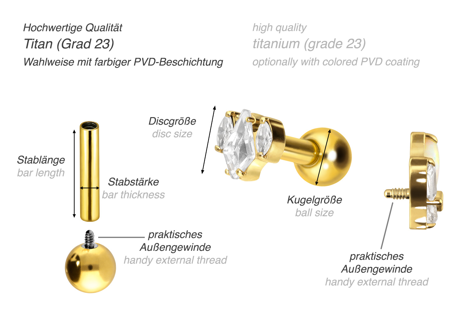 This stunningly beautiful ear piercing is made of high quality titanium, which is also known for material properties such as particularly good skin compatibility and high durability. Another of its advantages is color fastness, also guaranteed in the colored versions with PVD coating. Thanks to the appealing design, consisting of a timelessly beautiful screw-in attachment with external thread in form of a sparkling crystal shield combined with several crystal ovals, the piece of jewelry acquires a unique charm. The ear piercing has a bar thickness of 1.2 mm and a bar length of either 6 or 8 mm. Furthermore, both the attachment as well as the rear 3 mm ball through their 0.9 mm internal thread can be exchanged at will with all of our other screw-in attachments with this kind of external thread.