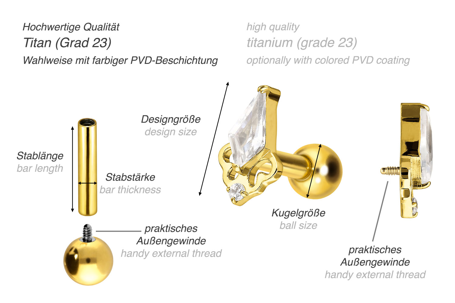 also guaranteed in the colored versions with PVD coating. Thanks to the appealing design, consisting of a timelessly beautiful screw-in attachment with external thread in form of a sparkling shield, the piece of jewelry acquires a unique charm. The ear piercing has a bar thickness of 1.2 mm and a bar length of either 6 or 8 mm.