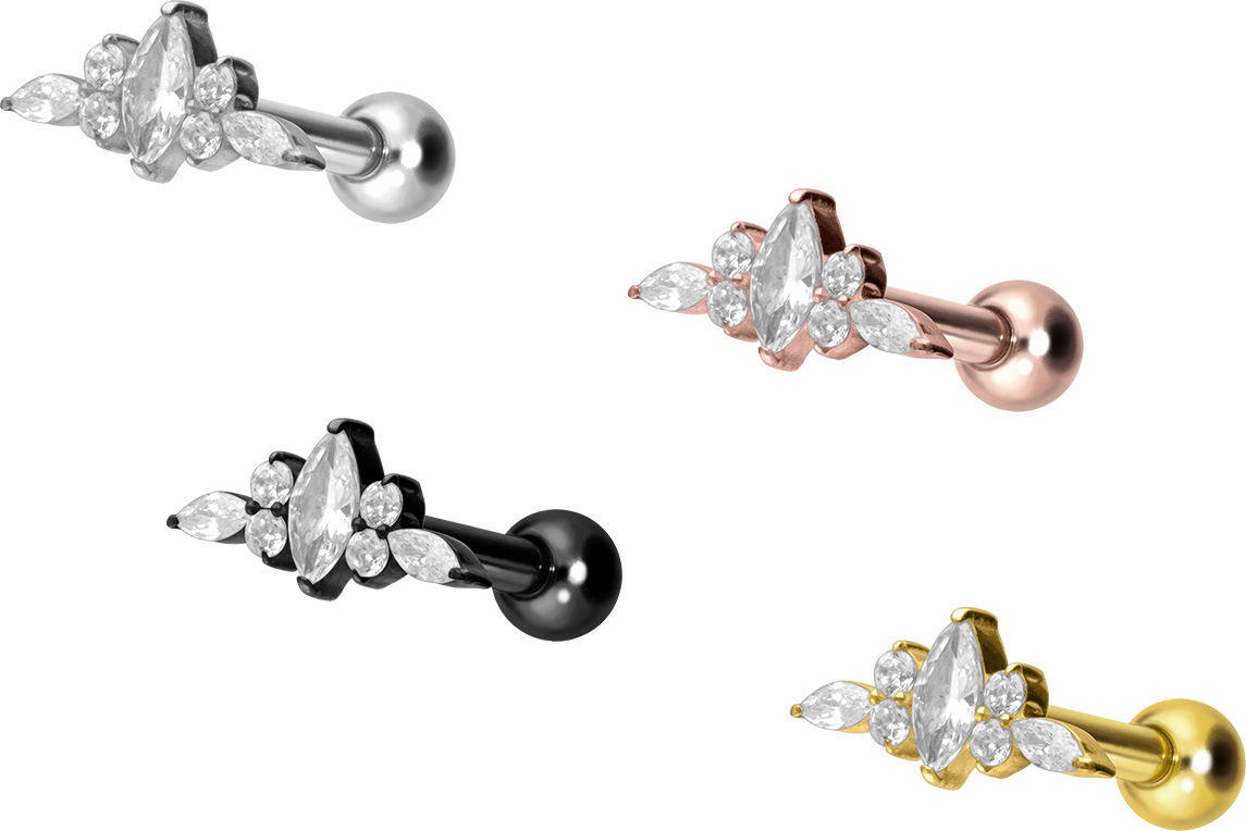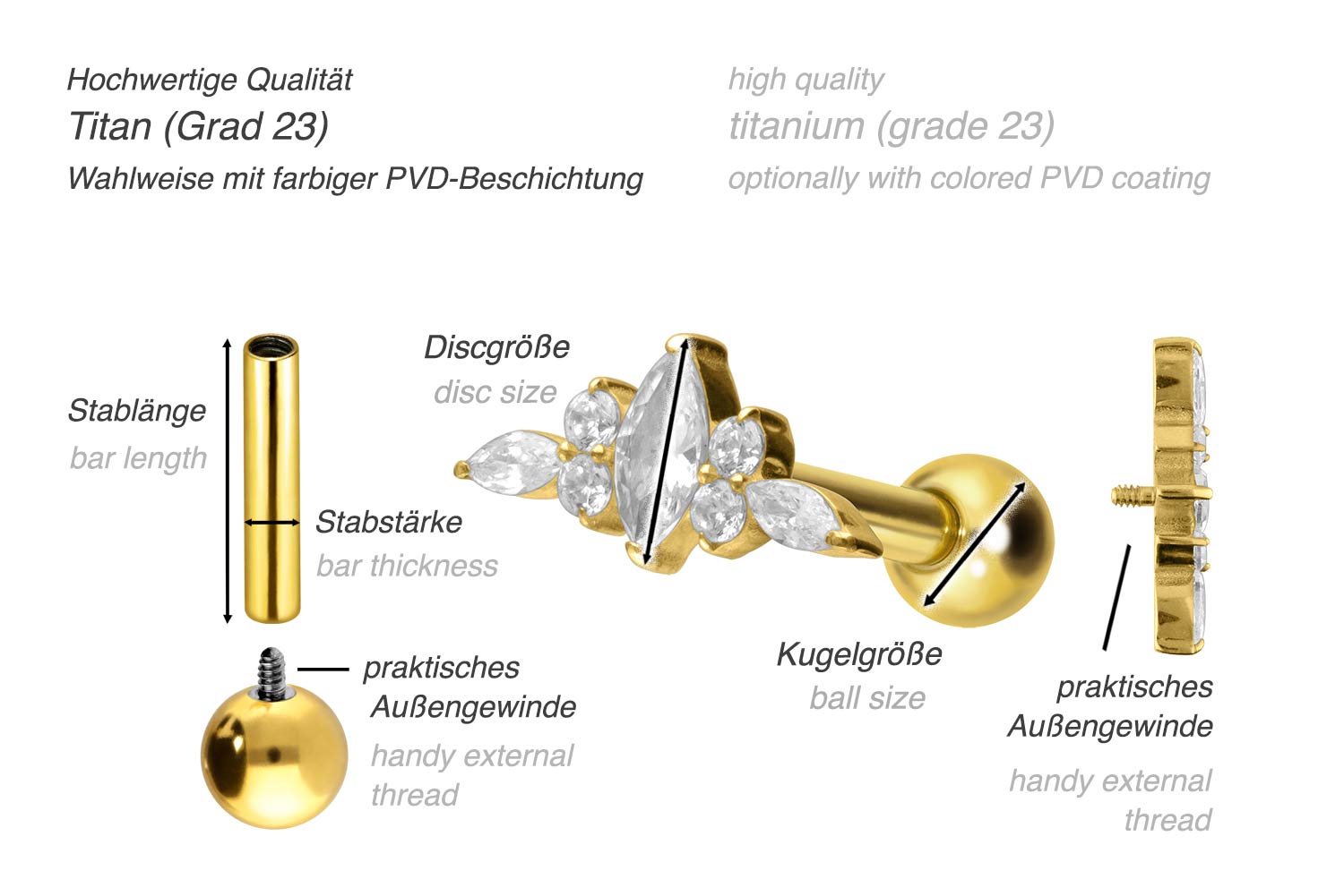 also guaranteed in the colored versions with PVD coating. Thanks to the appealing design, consisting of a timelessly beautiful screw-in attachment with external thread, the piece of jewelry acquires a unique charm. The ear piercing has a bar thickness of 1.2 mm and a bar length of either 6 or 8 mm.