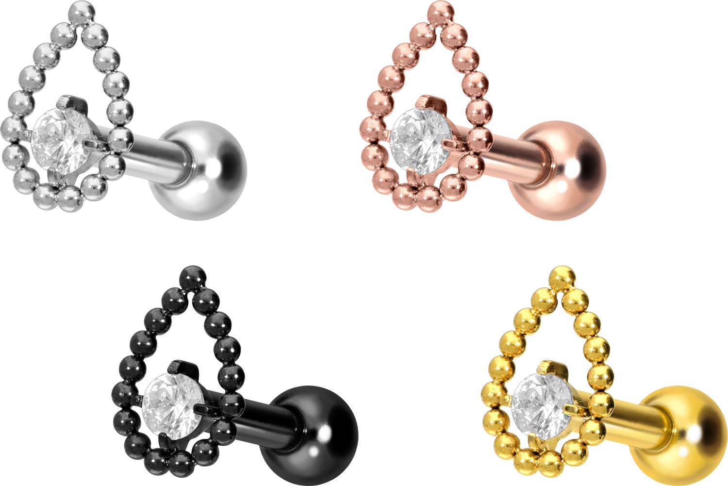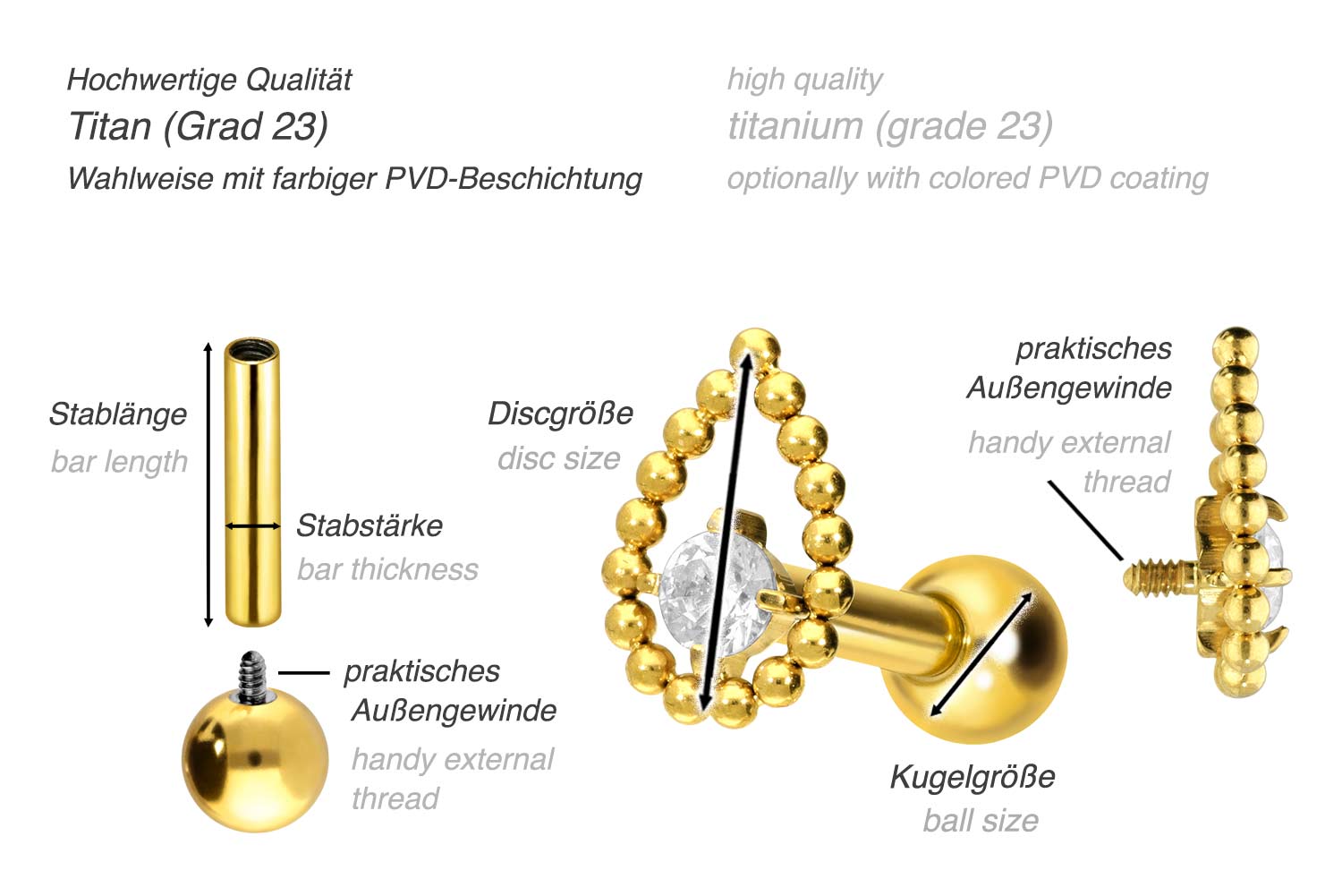 This stunningly beautiful ear piercing is made of high quality titanium, which is also known for material properties such as particularly good skin compatibility and high durability. Another of its advantages is color fastness, also guaranteed in the colored versions with PVD coating. Thanks to the appealing design, consisting of a timelessly beautiful screw-in attachment with external thread in form of a drop, which is decorated with a sparkling crystal, the piece of jewelry acquires a unique charm. The ear piercing has a bar thickness of 1.2 mm and a bar length of either 6 or 8 mm. Furthermore, both the attachment as well as the rear 3 mm ball through their 0.9 mm internal thread can be exchanged at will with all of our other screw-in attachments with this kind of external thread.