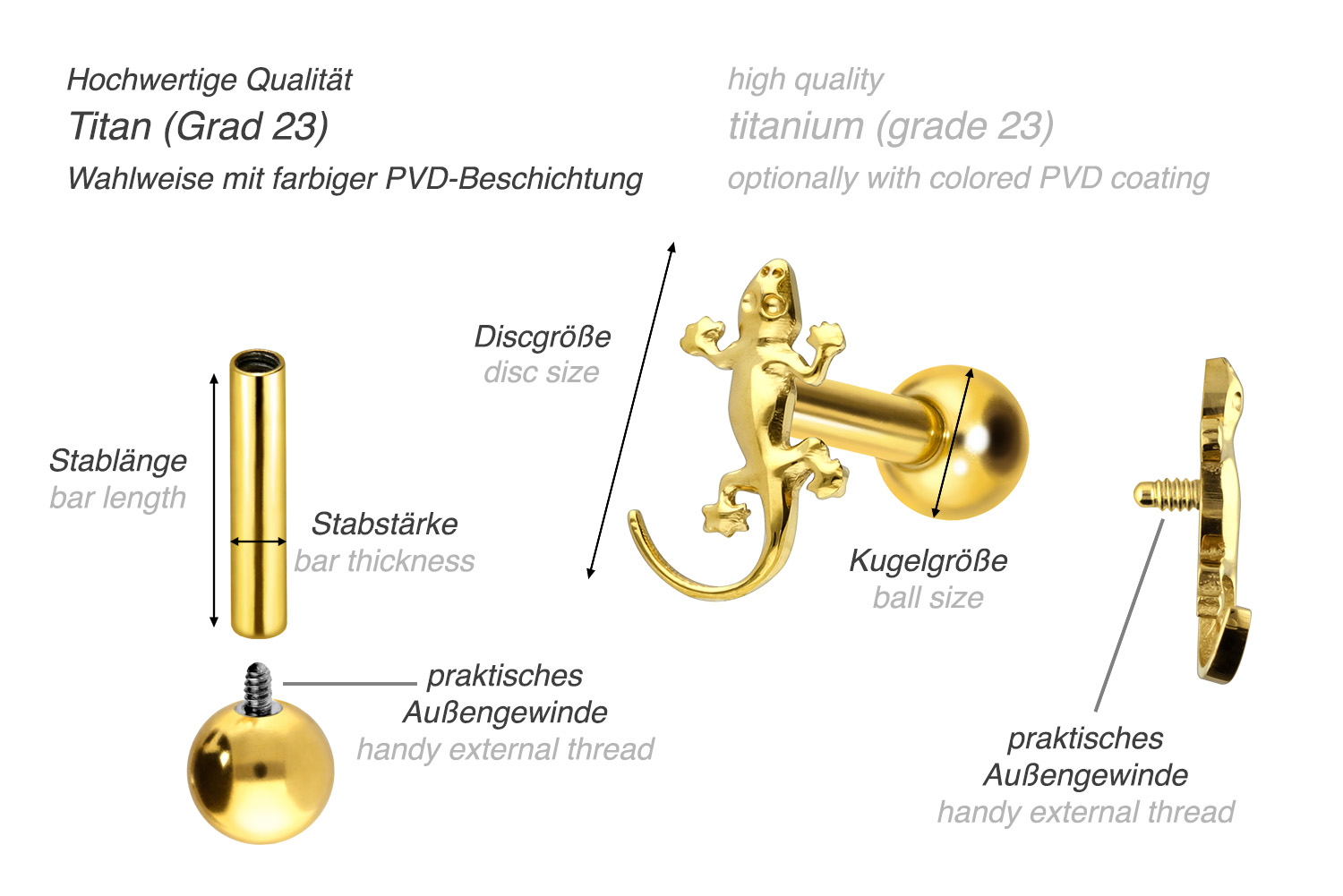 also guaranteed in the colored versions with PVD coating. Thanks to the appealing design, consisting of a timelessly beautiful screw-in attachment with external thread in form of a gecko, the piece of jewelry acquires a unique charm. The ear piercing has a bar thickness of 1.2 mm and a bar length of either 6 or 8 mm.