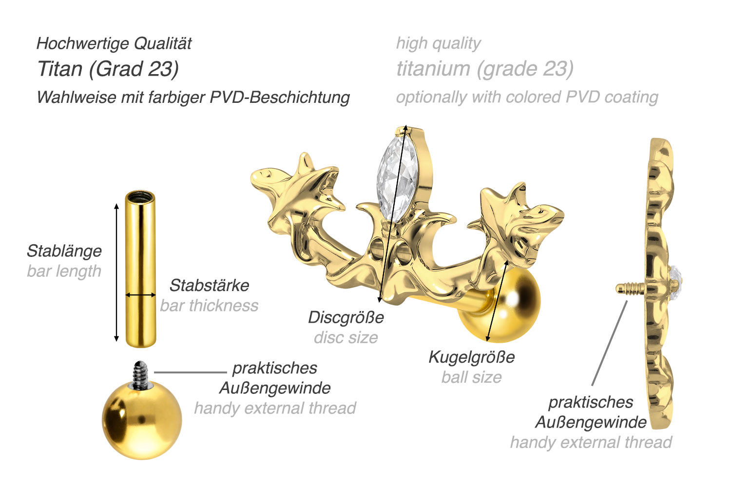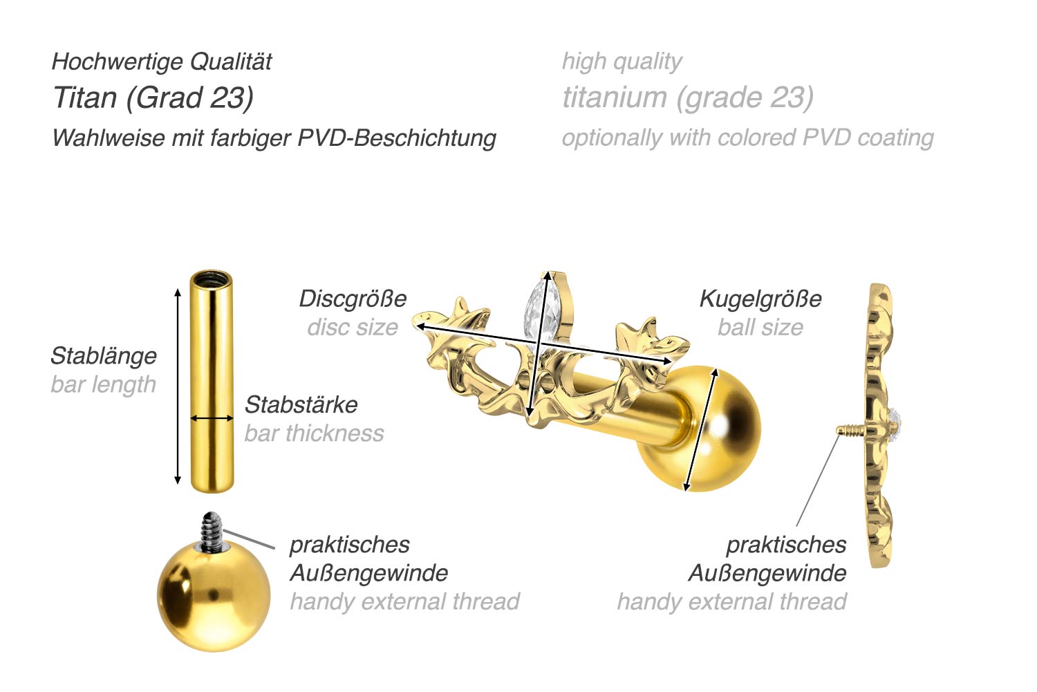 This stunningly beautiful ear piercing is made of high quality titanium, which is also known for material properties such as particularly good skin compatibility and high durability. Another of its advantages is color fastness, also guaranteed in the colored versions with PVD coating. Thanks to the appealing design, consisting of a timelessly beautiful screw-in attachment with external thread in form of a gothic design, the piece of jewelry acquires a unique charm. The ear piercing has a bar thickness of 1.2 mm and a bar length of either 6 or 8 mm. Furthermore, both the attachment as well as the rear 3 mm ball through their 0.9 mm internal thread can be exchanged at will with all of our other screw-in attachments with this kind of external thread.
