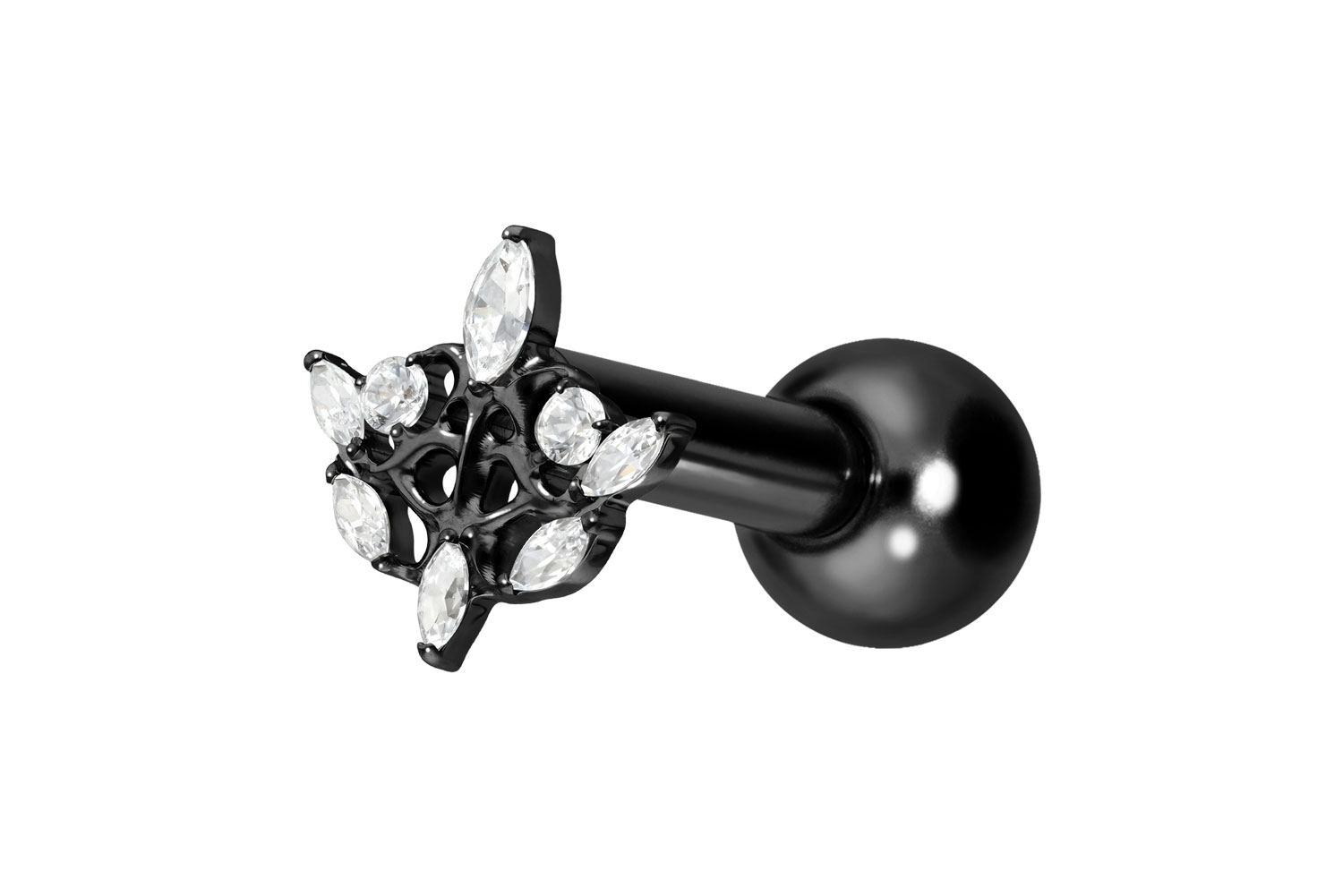 This stunningly beautiful ear piercing is made of high quality titanium, which is also known for material properties such as particularly good skin compatibility and high durability. Another of its advantages is color fastness, also guaranteed in the colored versions with PVD coating. Thanks to the appealing design, consisting of a timelessly beautiful screw-in attachment with external thread in form of a gothic design, the piece of jewelry acquires a unique charm. The ear piercing has a bar thickness of 1.2 mm and a bar length of either 6 or 8 mm. Furthermore, both the attachment as well as the rear 3 mm ball through their 0.9 mm internal thread can be exchanged at will with all of our other screw-in attachments with this kind of external thread.