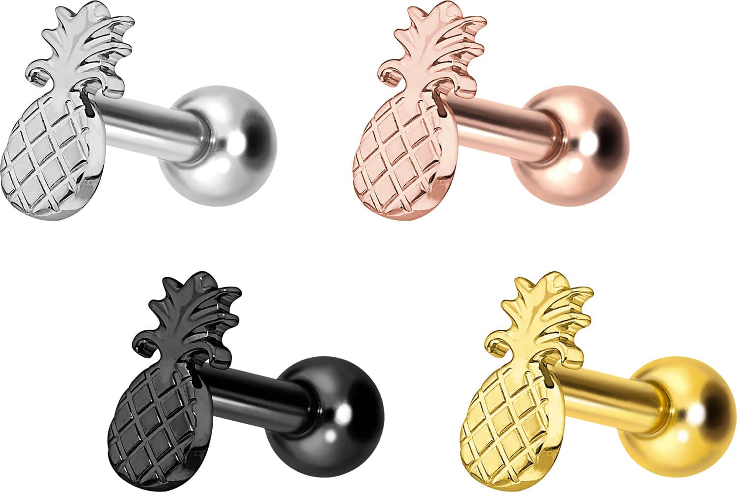 also guaranteed in the colored versions with PVD coating. Thanks to the appealing design, consisting of a timelessly beautiful screw-in attachment with external thread in form of a pineapple, the piece of jewelry acquires a unique charm. The ear piercing has a bar thickness of 1.2 mm and a bar length of either 6 or 8 mm.