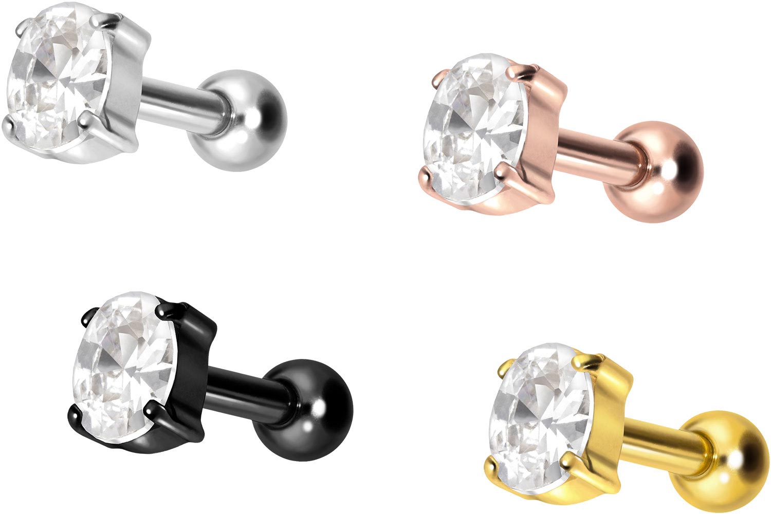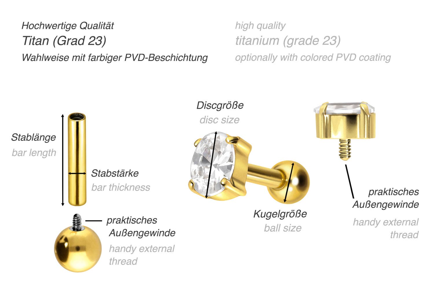 This stunningly beautiful ear piercing is made of high quality titanium, which is also known for material properties such as particularly good skin compatibility and high durability. Another of its advantages is color fastness, also guaranteed in the colored versions with PVD coating. Thanks to the appealing design, consisting of a timelessly beautiful screw-in attachment with external thread in form of a crystal oval, the piece of jewelry acquires a unique charm. The ear piercing has a bar thickness of 1.2 mm and a bar length of either 6 or 8 mm. Furthermore, both the attachment as well as the rear 3 mm ball through their 0.9 mm internal thread can be exchanged at will with all of our other screw-in attachments with this kind of external thread.