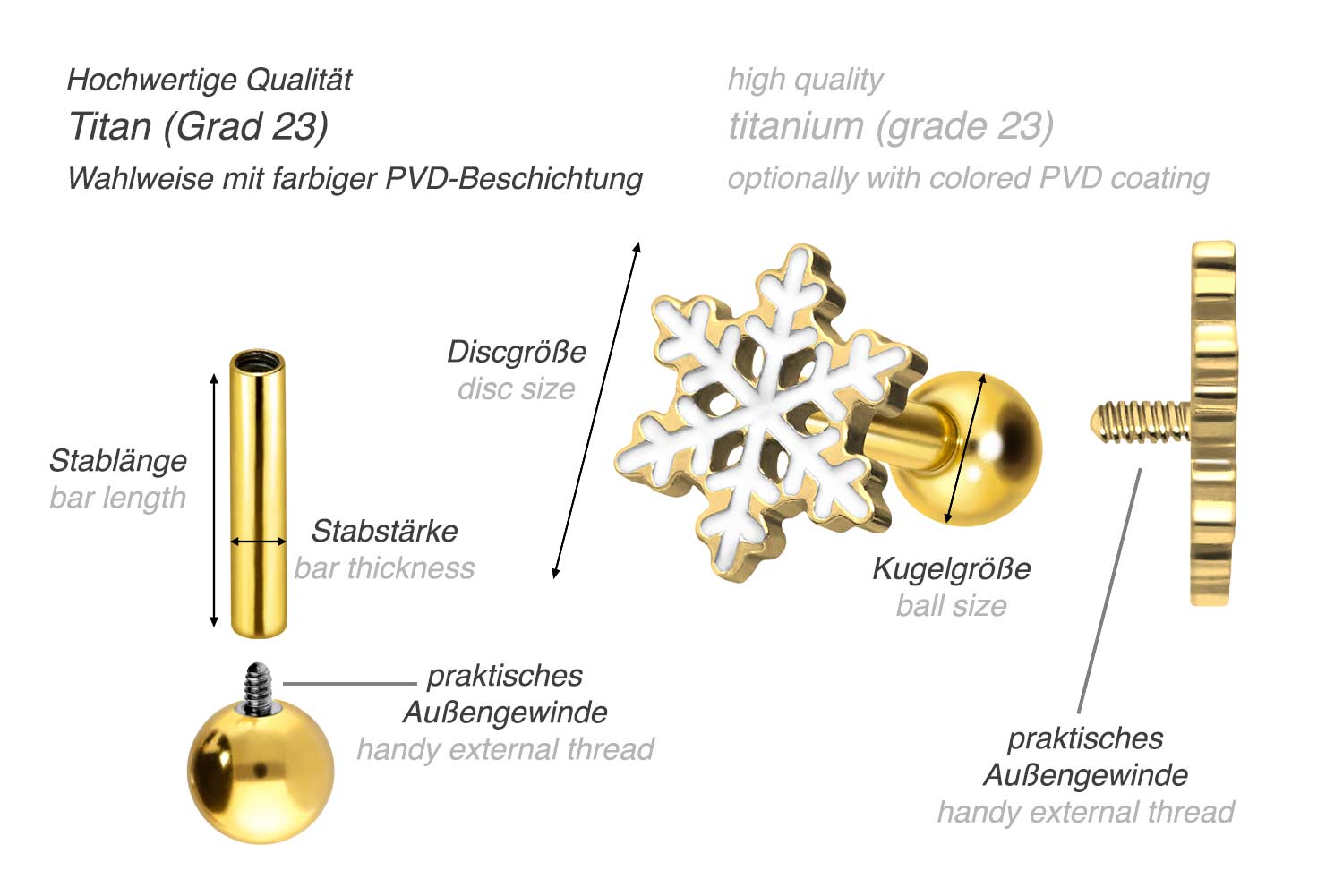 This stunningly beautiful ear piercing is made of high quality titanium, which is also known for material properties such as particularly good skin compatibility and high durability. Another of its advantages is color fastness, also guaranteed in the colored versions with PVD coating. Thanks to the appealing design, consisting of a timelessly beautiful screw-in attachment with external thread in form of a snowflake, the piece of jewelry acquires a unique charm. The ear piercing has a bar thickness of 1.2 mm and a bar length of either 6 or 8 mm. Furthermore, both the attachment as well as the rear 3 mm ball through their 0.9 mm internal thread can be exchanged at will with all of our other screw-in attachments with this kind of external thread.