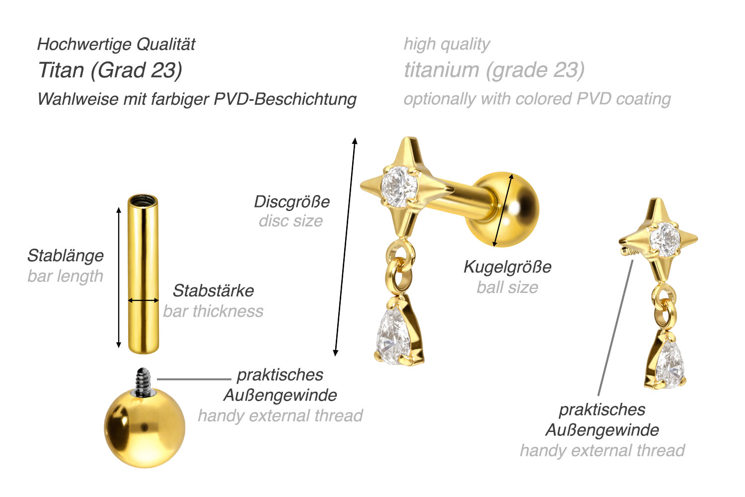 This stunningly beautiful ear piercing is made of high quality titanium, which is also known for material properties such as particularly good skin compatibility and high durability. Another of its advantages is color fastness, also guaranteed in the colored versions with PVD coating. Thanks to the appealing design, consisting of a timelessly beautiful screw-in attachment with external thread in form of a star, to which a sparkling crystal drop is attached, the piece of jewelry acquires a unique charm. The ear piercing has a bar thickness of 1.2 mm and a bar length of either 6 or 8 mm. Furthermore, both the attachment as well as the rear 3 mm ball through their 0.9 mm internal thread can be exchanged at will with all of our other screw-in attachments with this kind of external thread.