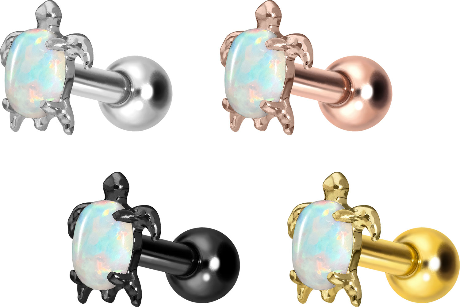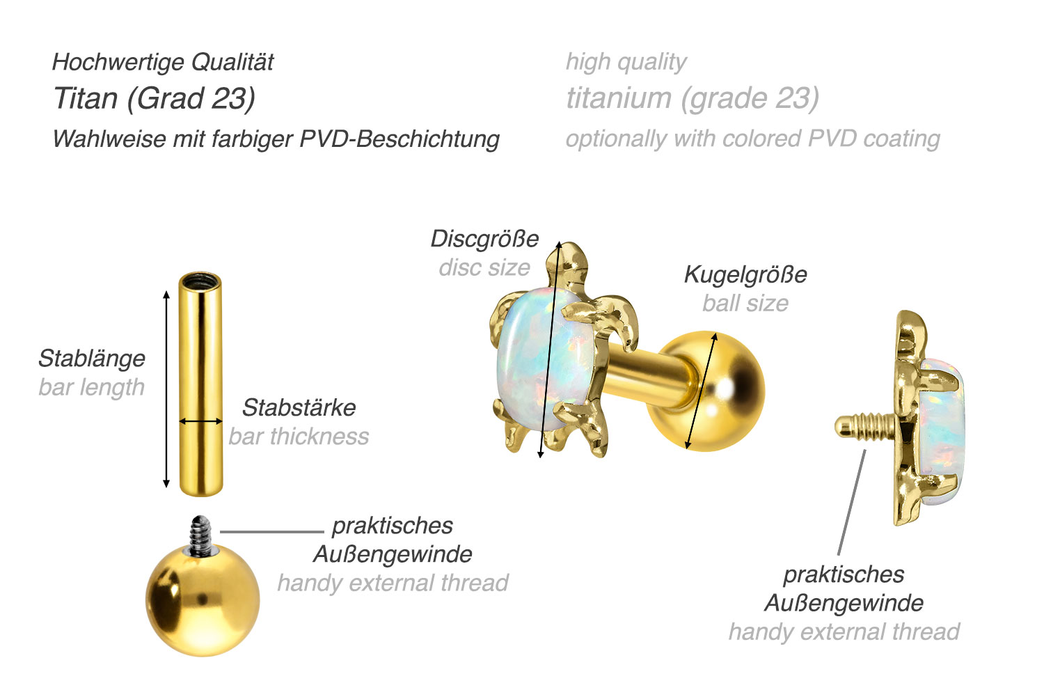 This stunningly beautiful ear piercing is made of high quality titanium, which is also known for material properties such as particularly good skin compatibility and high durability. Another of its advantages is color fastness, also guaranteed in the colored versions with PVD coating. Thanks to the appealing design, consisting of a timelessly beautiful screw-in attachment with external thread in form of a turtle, the piece of jewelry acquires a unique charm. The ear piercing has a bar thickness of 1.2 mm and a bar length of either 6 or 8 mm. Furthermore, both the attachment as well as the rear 3 mm ball through their 0.9 mm internal thread can be exchanged at will with all of our other screw-in attachments with this kind of external thread.