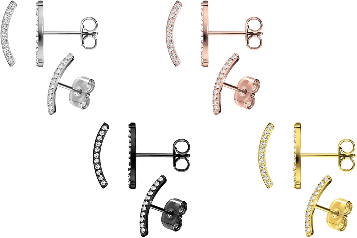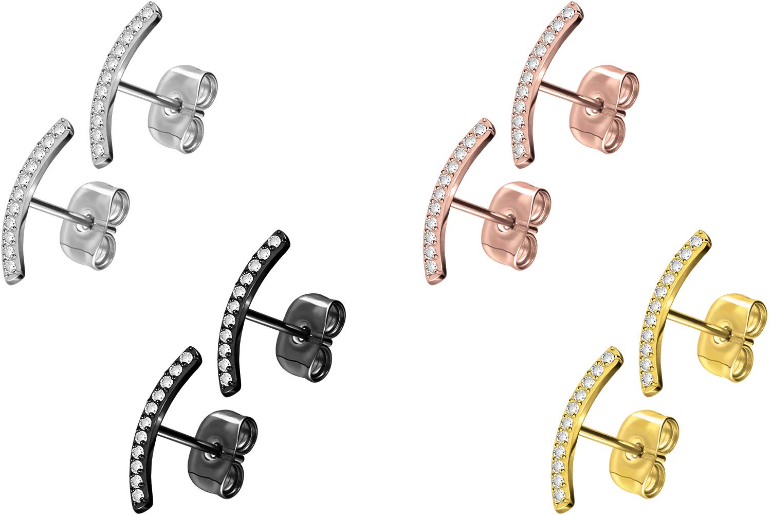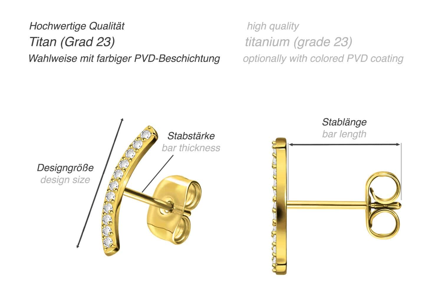 These timelessly beautiful ear studs are made of high quality titanium, which among other advantages is characterized by good skin compatibility and high durability. Another of its specific material properties is color fastness, also guaranteed in the variants with PVD coating. Both studs are adorned with an arch each, which is set with sparkling crystals and thus shines in full magnificence. They are furthermore supplied in pairs as depicted.