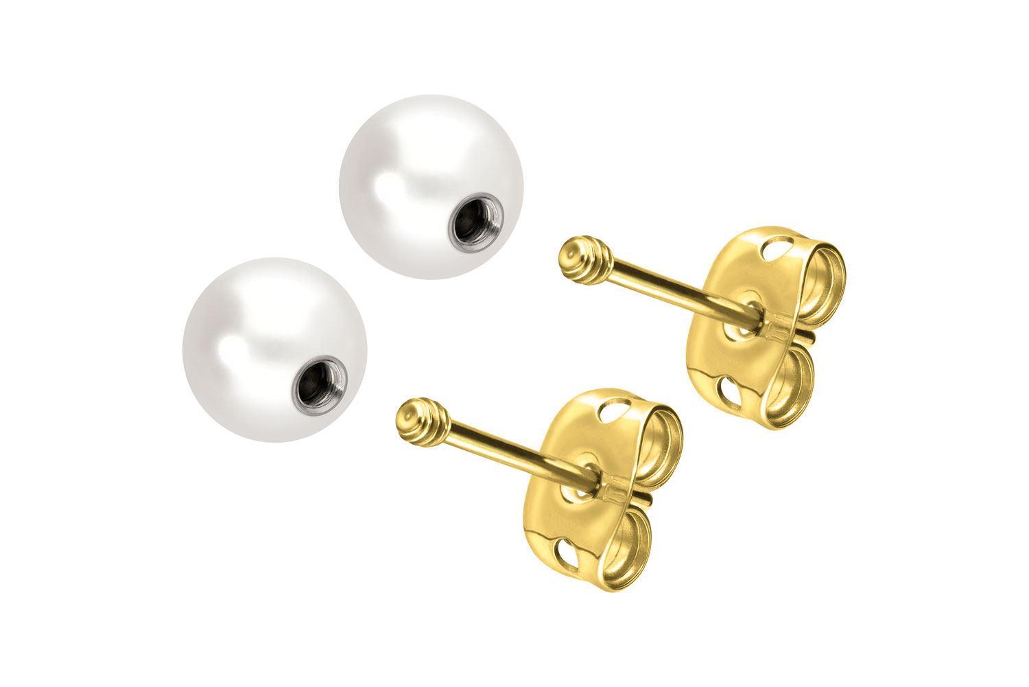 compatibility and high durability. Another of its specific material properties is color fastness, also guaranteed in the variants with PVD coating. The genuine freshwater pearls, which are screwed onto the optional 1.2 mm or 1.6 mm thick thread, look particularly appealing due to their simple design. In addition, the ear studs are supplied in pairs as depicted.