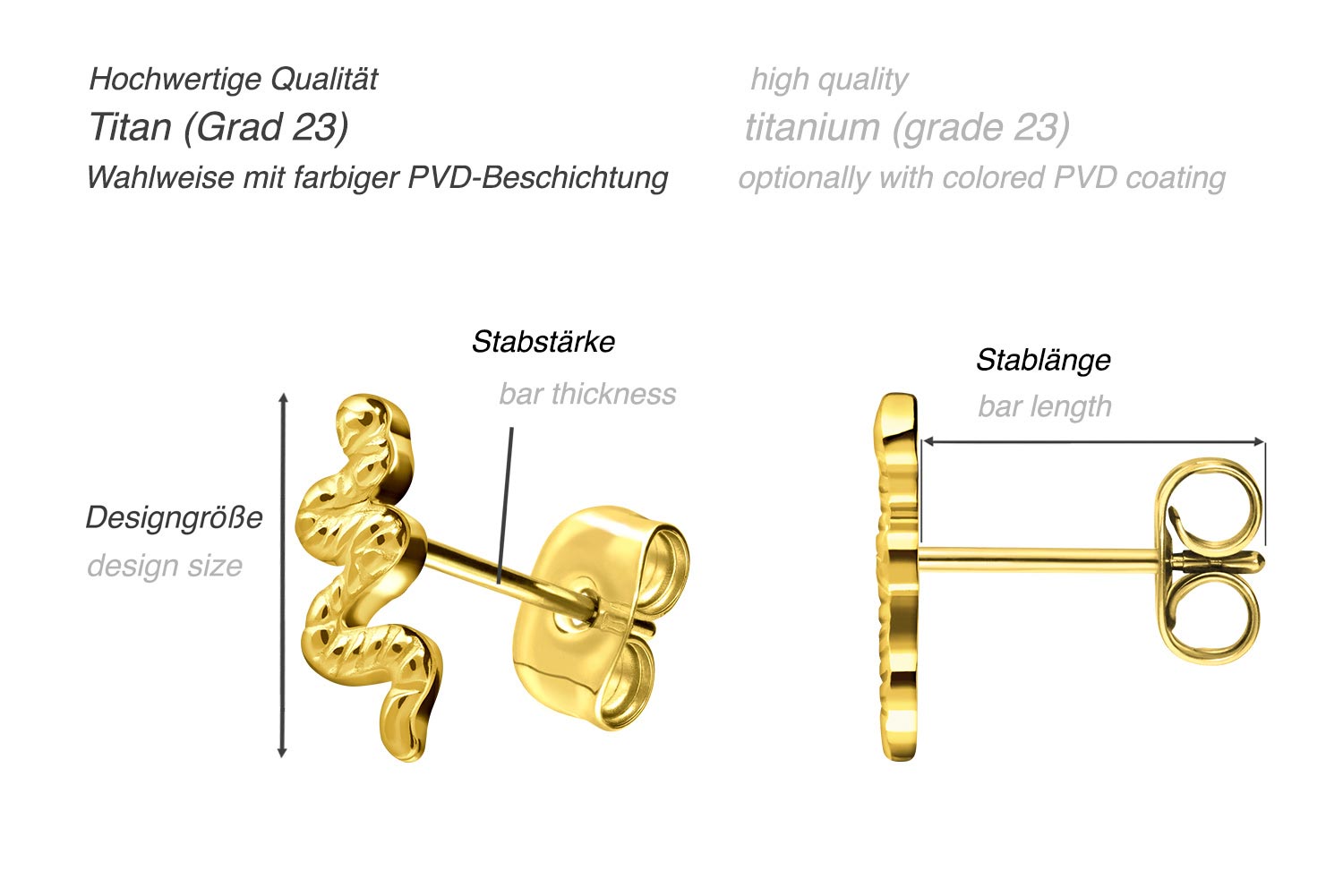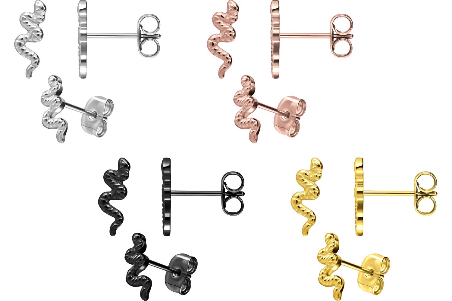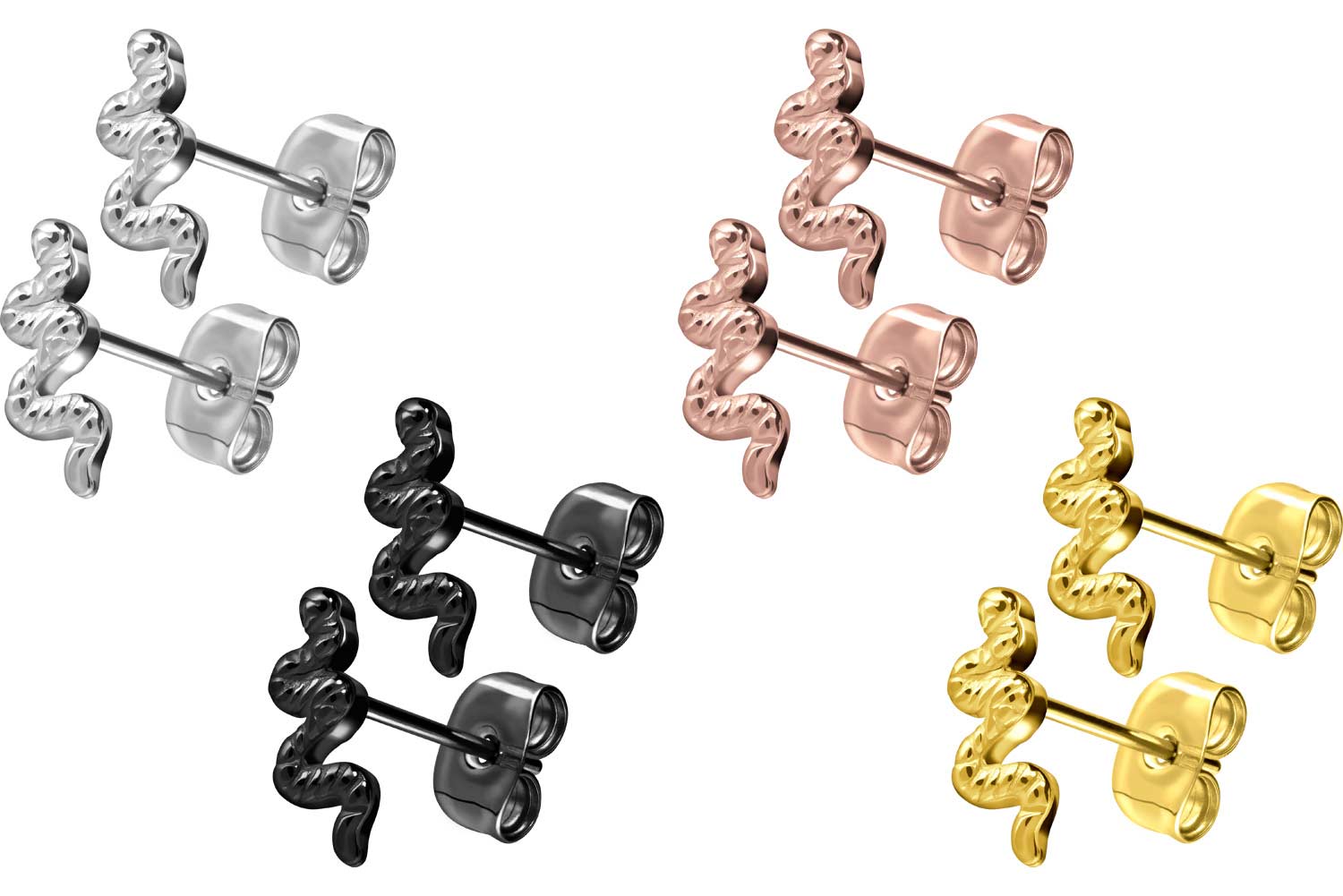 compatibility and high durability. Another of its specific material properties is color fastness, also guaranteed in the variants with PVD coating. The snakes, which are located at the front ends of the studs, look particularly appealing due to their simple design. In addition, the ear studs are supplied in pairs as depicted.