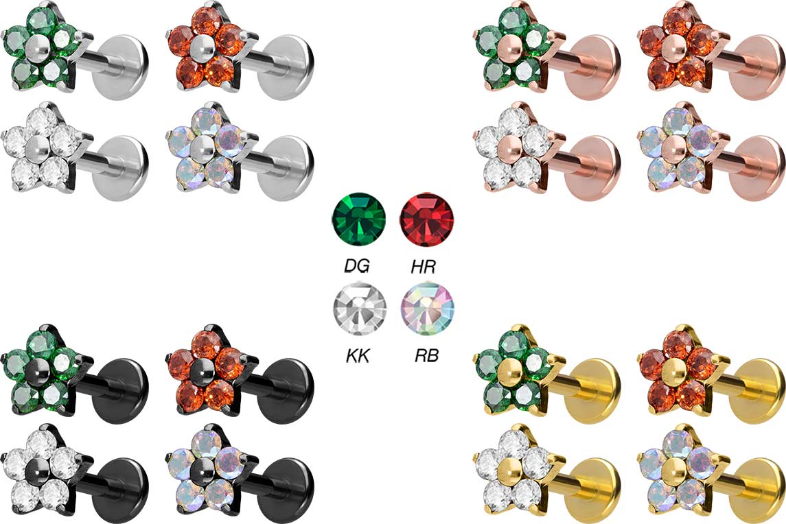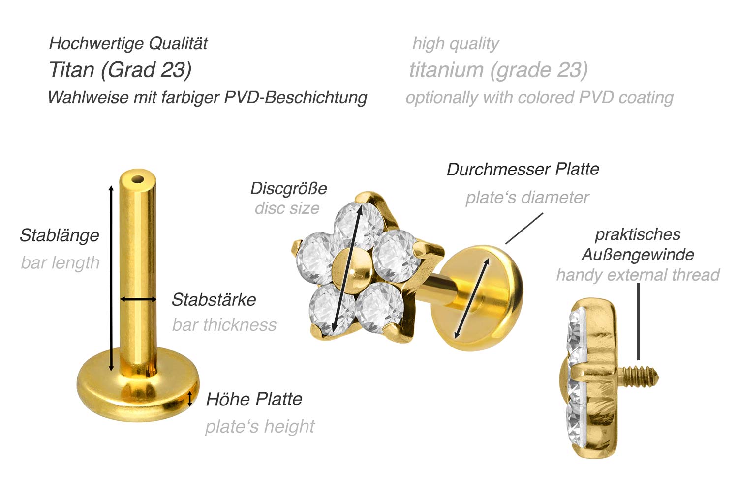 is supplied with a timelessly beautiful screw-in attachment with external thread in form of a sparkling crystal flower, has a bar thickness of either 1.2