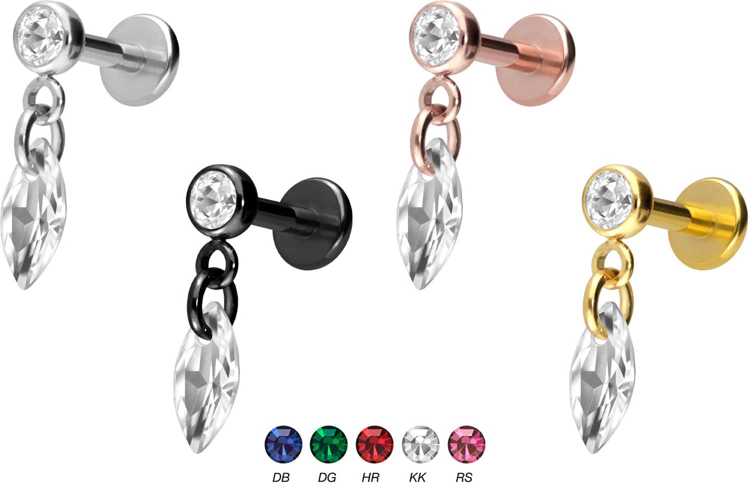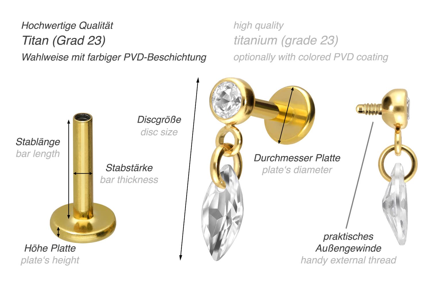 This unique labret is made of high quality titanium, which is also known for material properties such as particularly good skin compatibility and high durability. Another of its advantages is color fastness, also guaranteed in the colored versions with PVD coating. The labret is supplied with a timelessly beautiful screw-in attachment with external thread in form of a sparkling oval, has a bar thickness of either 1.2 or 1.6 mm and is available with the bar lengths listed below. Furthermore, its 0.9 mm internal thread can be combined at will with all of our other screw-in attachments with this kind of external thread.