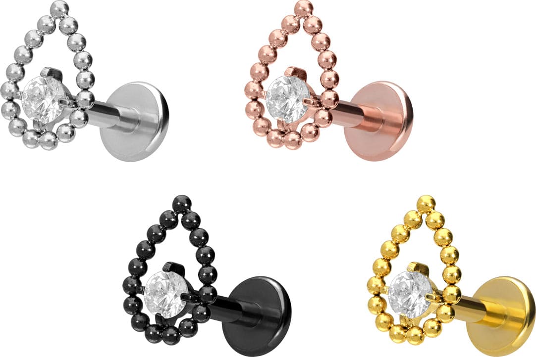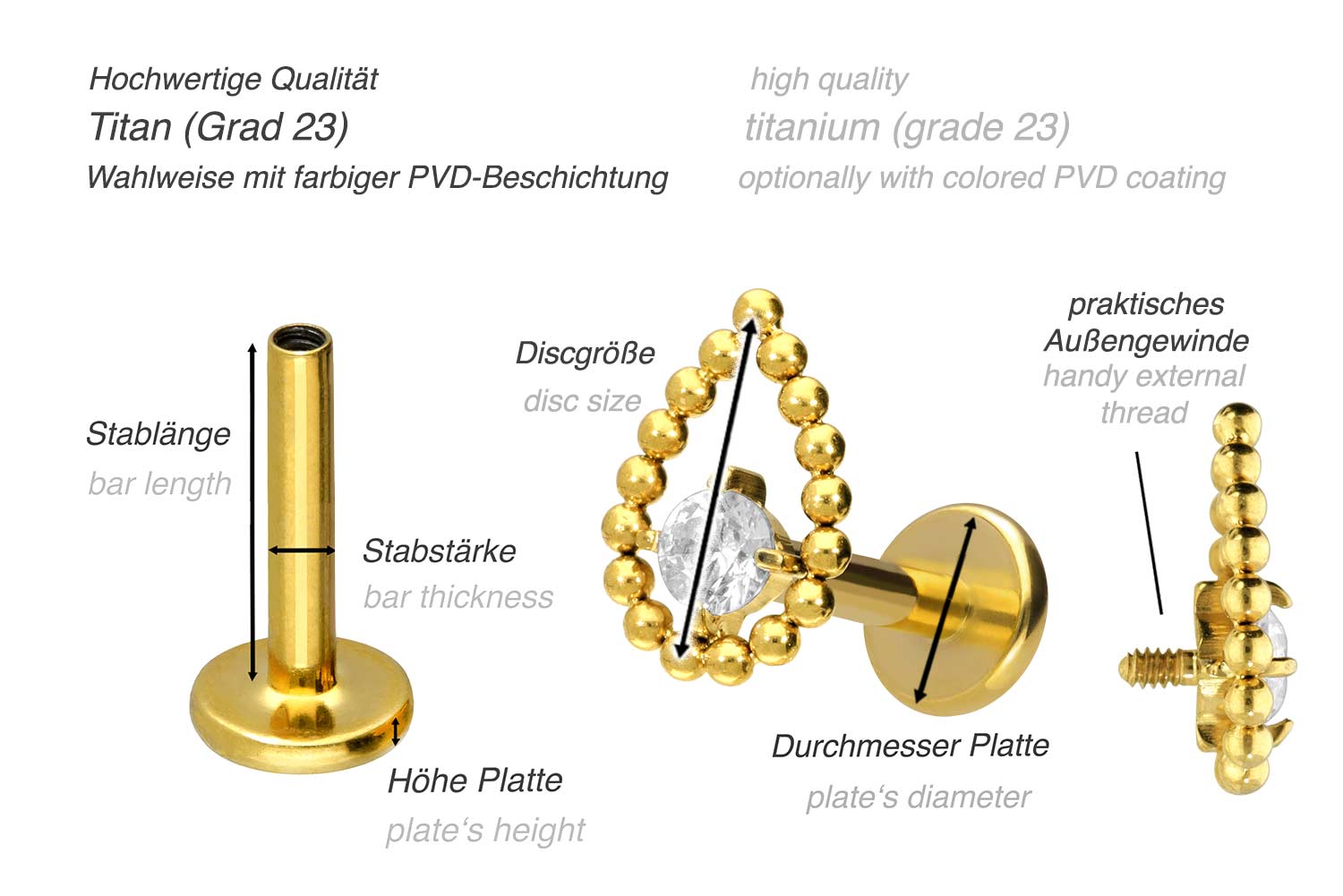 This unique labret is made of high quality titanium, which is also known for material properties such as particularly good skin compatibility and high durability. Another of its advantages is color fastness, also guaranteed in the colored versions with PVD coating. The labret is supplied with a timelessly beautiful screw-in attachment with external thread in form of a drop, which is decorated with a sparkling crystal, has a bar thickness of either 1.2 or 1.6 mm and is available with the bar lengths listed below. Furthermore, its 0.9 mm internal thread can be combined at will with all of our other screw-in attachments with this kind of external thread.