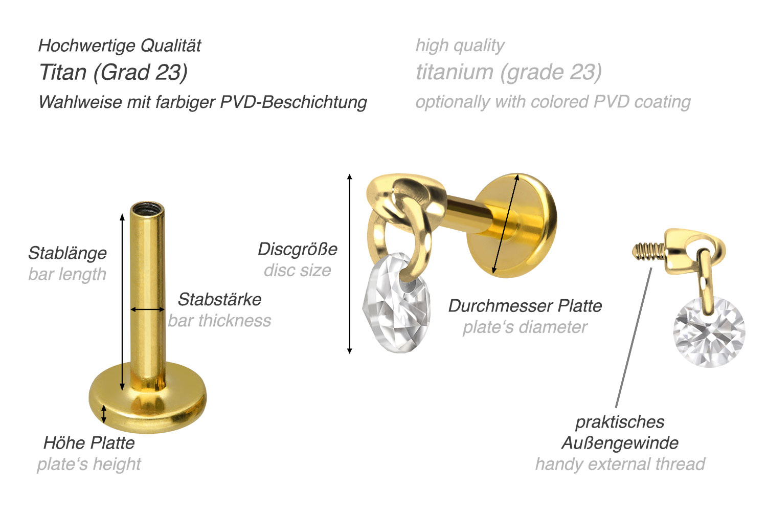 This unique labret is made of high quality titanium, which is also known for material properties such as particularly good skin compatibility and high durability. Another of its advantages is color fastness, also guaranteed in the colored versions with PVD coating. The labret is supplied with a timelessly beautiful screw-in attachment with external thread in form of a sparkling crystal, has a bar thickness of either 1.2 or 1.6 mm and is available with the bar lengths listed below. Furthermore, its 0.9 mm internal thread can be combined at will with all of our other screw-in attachments with this kind of external thread.