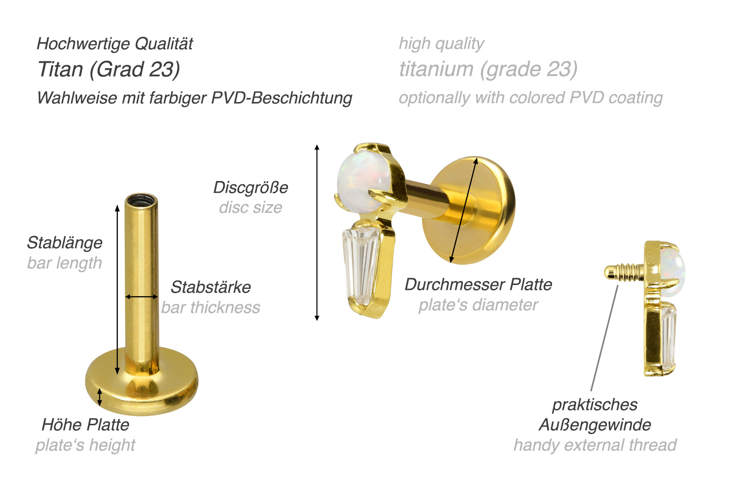Titanium - Labret with internal Thread synthetic Opal + Crystal Rectangle