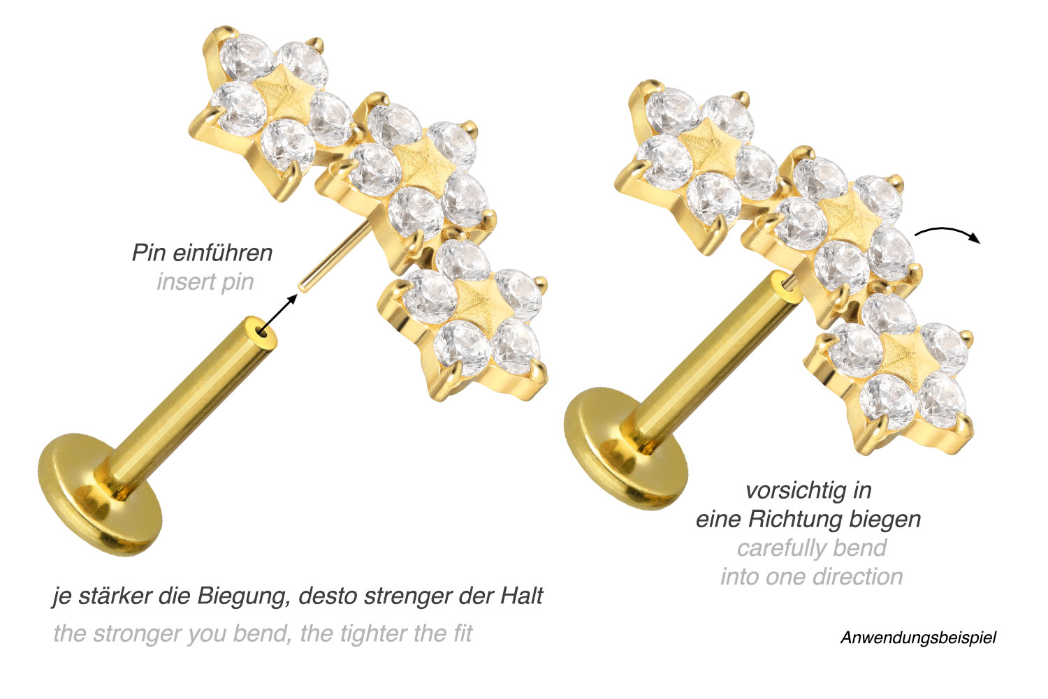 or 1.2 mm and is available with the bar lengths listed below. Due to the push fit technology used, the labret can be combined at will with all of our attachments with push pin.