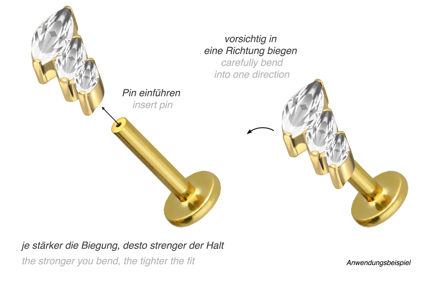 or 1.2 mm and is available with the bar lengths listed below. Due to the push fit technology used, the labret can be combined at will with all of our attachments with push pin.