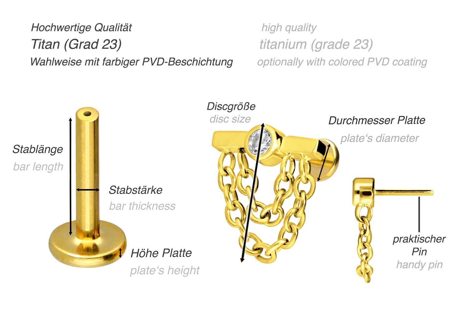 or 1.2 mm and is available with the bar lengths listed below. Due to the push fit technology used, the labret can be combined at will with all of our attachments with push pin.
