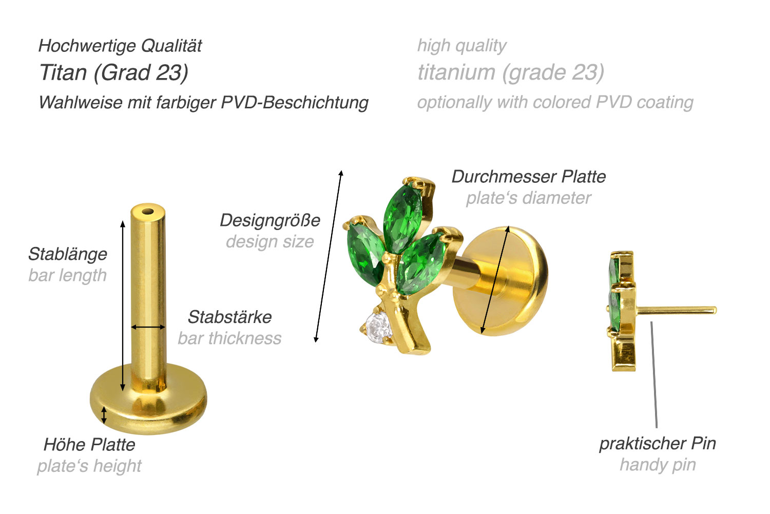 or 1.2 mm and is available with the bar lengths listed below. Due to the push fit technology used, the labret can be combined at will with all of our attachments with push pin.