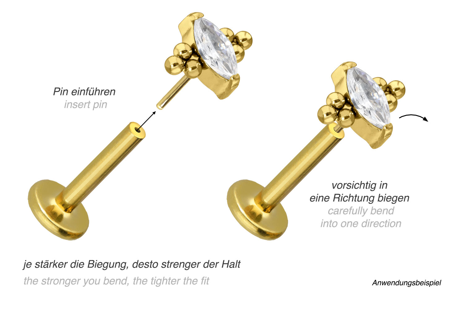 or 1.2 mm and is available with the bar lengths listed below. Due to the push fit technology used, the labret can be combined at will with all of our attachments with push pin.