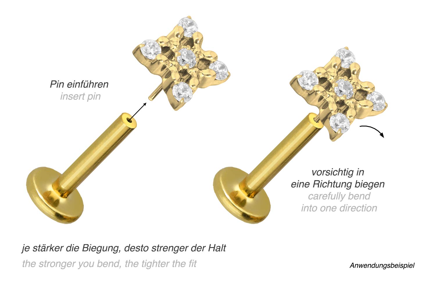 or 1.2 mm and is available with the bar lengths listed below. Due to the push fit technology used, the labret can be combined at will with all of our attachments with push pin.