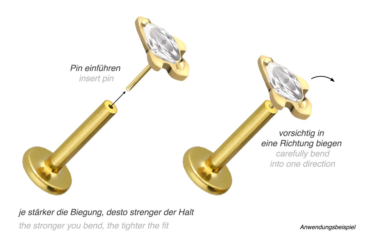 or 1.2 mm and is available with the bar lengths listed below. Due to the push fit technology used, the labret can be combined at will with all of our attachments with push pin.